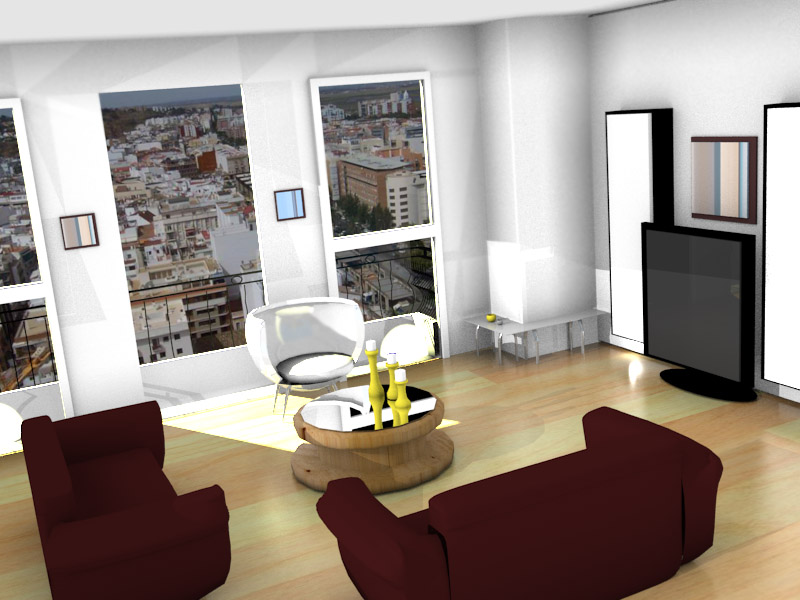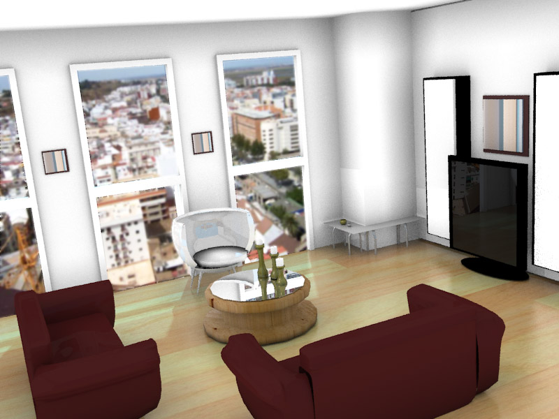 Después, le daría un poco más de Bump en paredes y en los sofá, mientras que en la mesa y en la butaca le quitaría un poco de mirror a las superficies reflectantes, fundamentalmente la butaca refleja de más a mi parecer. Por otro lado, la mesa no está muy poligonal? (no conozco que modelo quisiste hacer, esa fue la impresión que me dió en primera instancia).