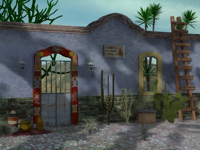 Me gustan más las que están en sepia, casi me han transportado a la película el mejicano. La que está en color pierde ese aire árido precisamente por el azul de la tapia. Yo le retocaría los tonos para que presentara colores más desplazados hacia el amarillo, te quedaría un buen tema como has hecho con el sepia.