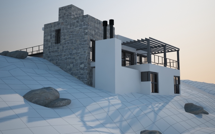 El proyecto esta implantado en un desnivel rocoso con vegetación, opte por por modelar ctodo, rocas, terreno y obviamente la casa.