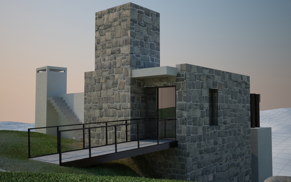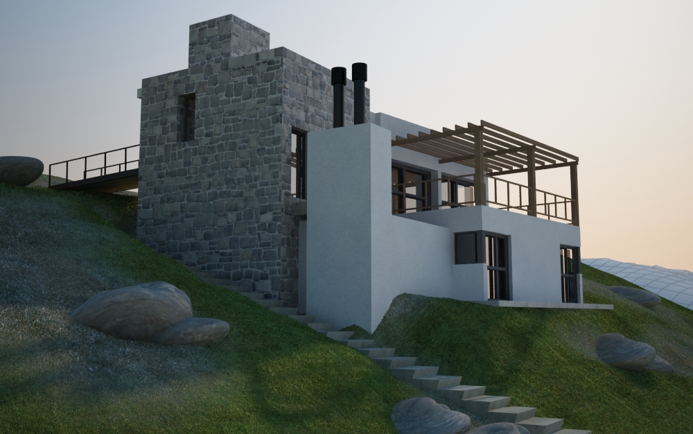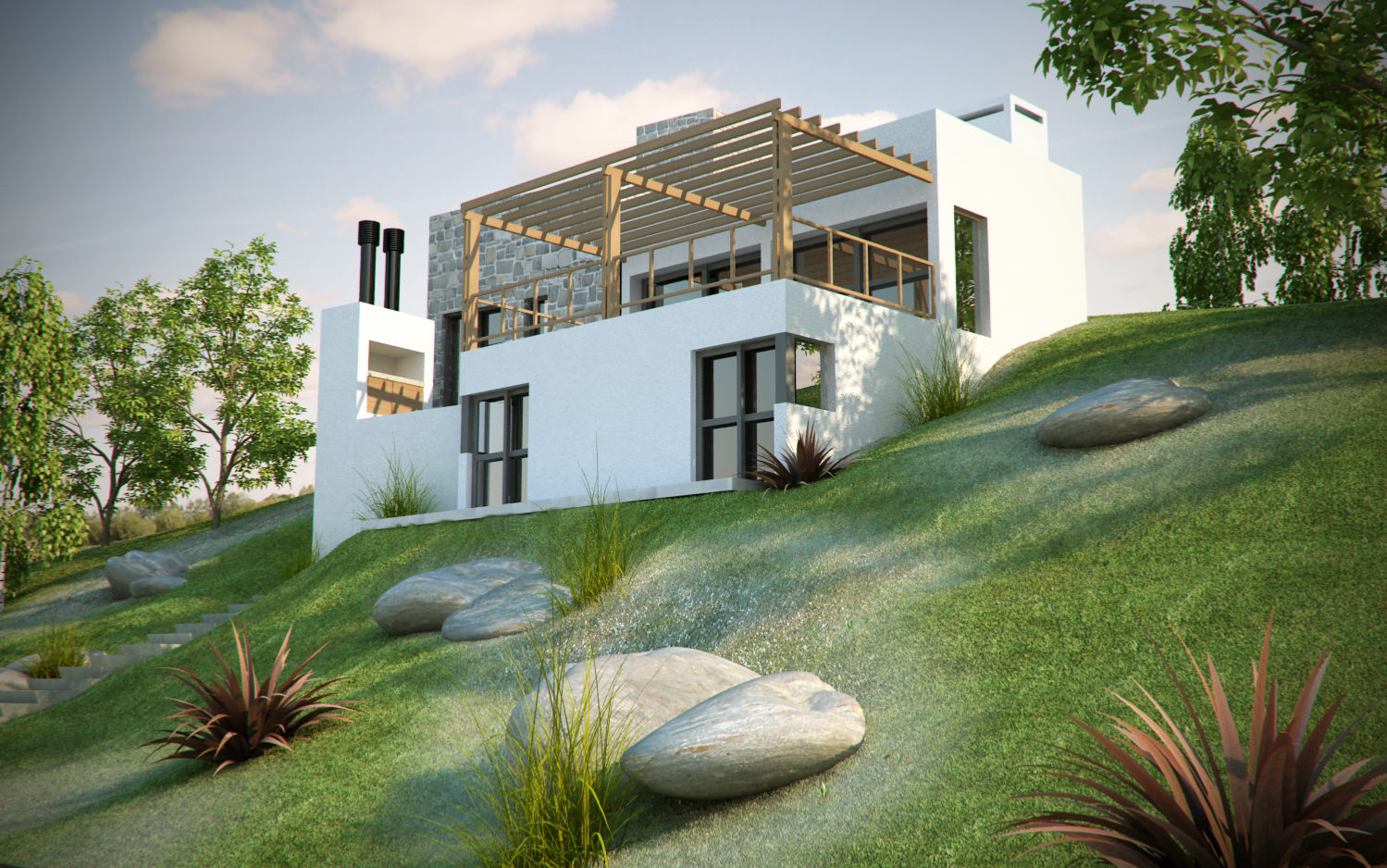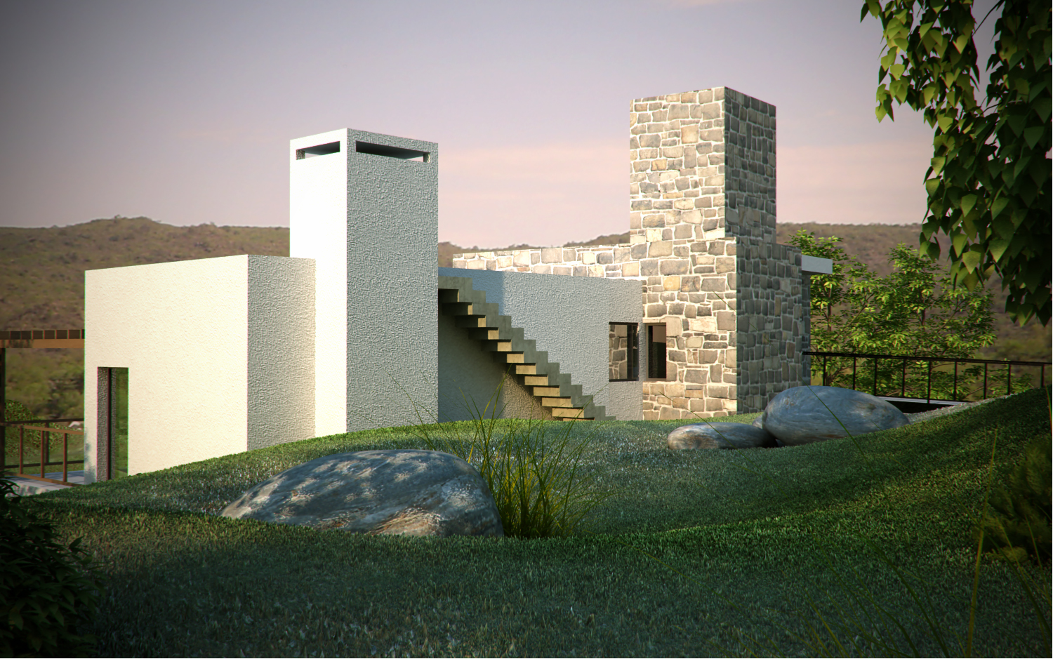 Hola. Me gustó mucho la combinación del declive con la propiedad y los muros de mampostería me gustaron mucho. Con respecto al render, también tiene muy buena pinta, lo único que si le movería un poco es en la textura de las piedras, parecen piedras de Rio gigantes y la verdad como que se ven un poco fuera de. Yo les pondría un desplazamiento de Vray para darles más vida.