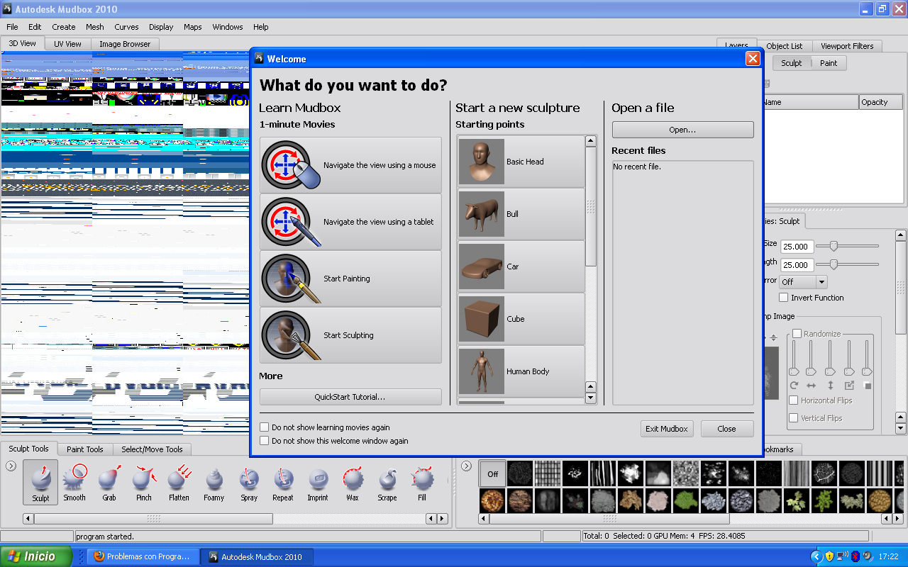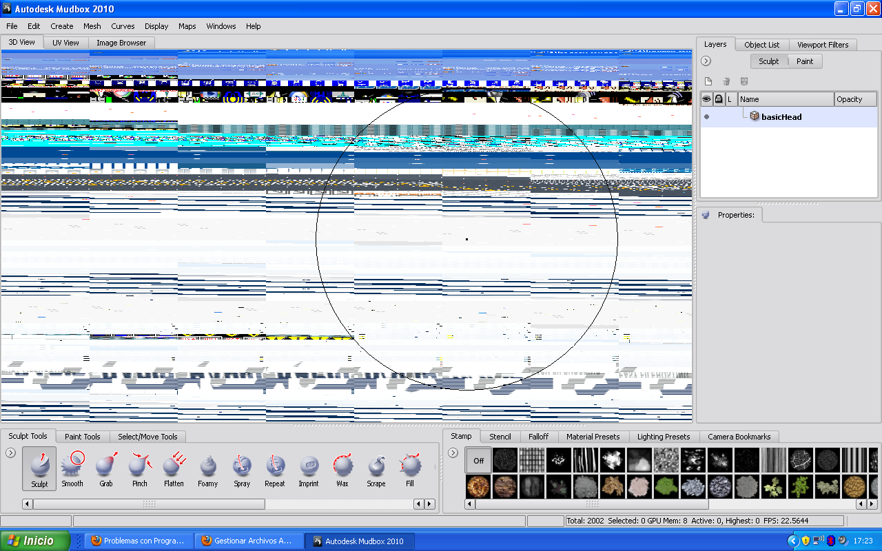 Tan solo abrir el Mudbox, cuando aparece la pantalla de bienvenida se me distorsiona la pantalla de 3d view con lo cual no puedo trabajar. Aunque cargue algún modelo o intente cambiar la vista no afecta en absoluto a la pestaña, si alguien sabe solucionar el problema o conoce alguna persona que me made un mensaje o algo de manera que, me pueda poner en contacto. Gracias.