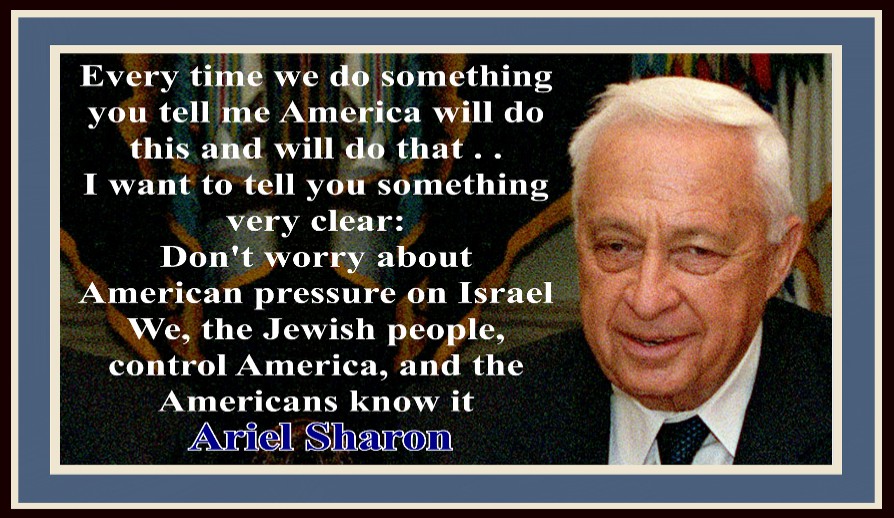 Me olvide traducir la frase de sharon que no es un detalle para dejarlo pasar inadvertido. En octubre del 2001 Ariel sharon(en esos tiempos primerministro) le dijo al entonces ministro de relaciones exteriores shimon peres quiero decirte algo muy claro: no te preocupes por la presión americana sobre Israel, nosotros los judíos controlamos América, y los americanos lo saben.