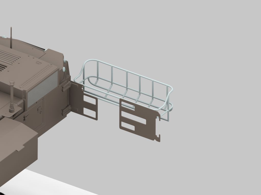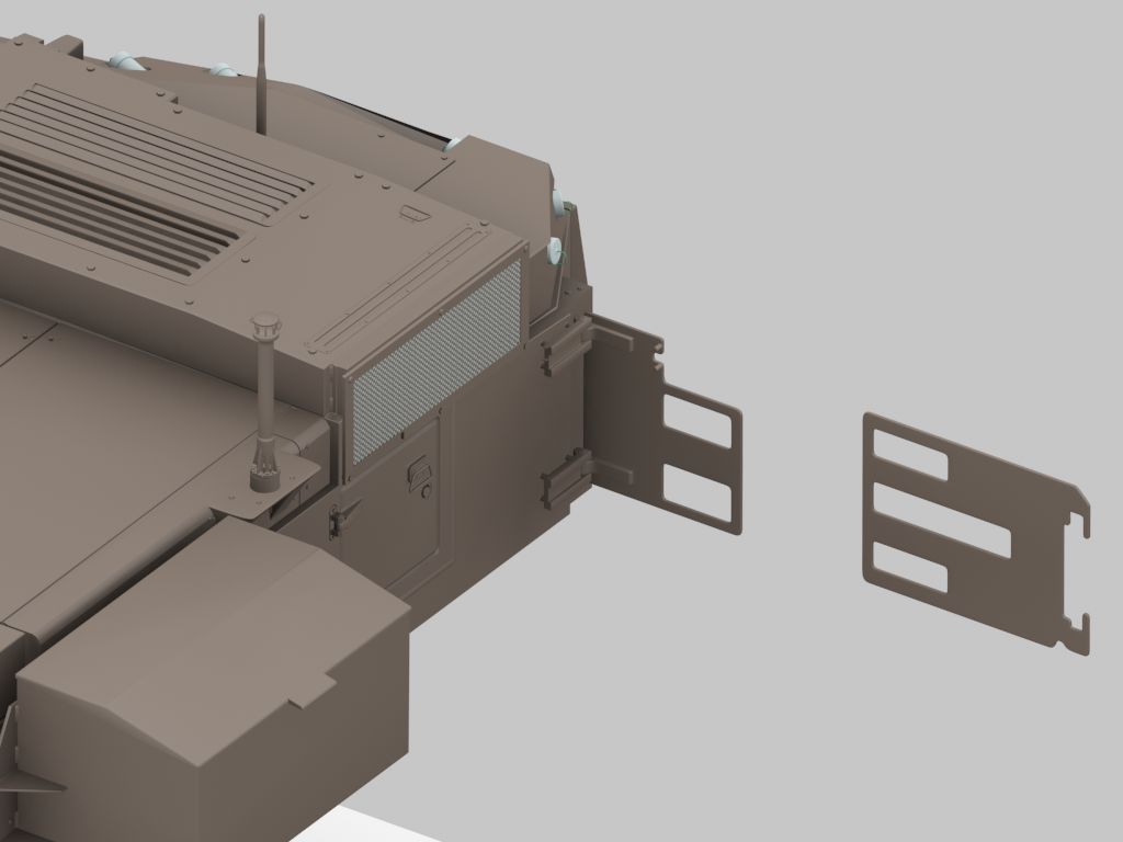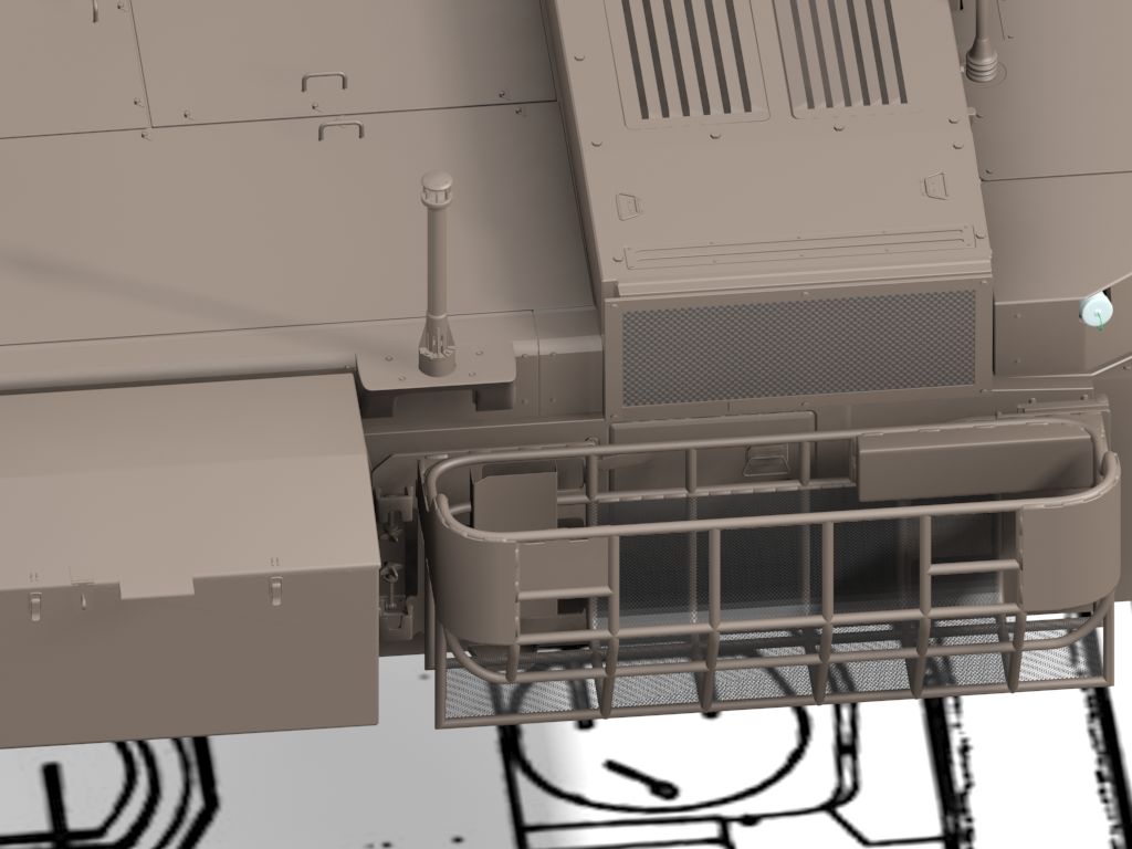 Bueno nos metemos ya con la torre propiamente dicha. Al ser asimétrica he empezado por el lado derecho. En esa especie de cajón o hueco irán los lanzagranadas del sistema galix, con una tapa en la que sólo se verán las salidas de los tubos por unos huecos exagonales creo. Falta añadir el blindaje extra, pero es que, estoy con el periscopio principal de localización de objetivos del jefe del carro. Falta un visor justo debajo de éste en esa especie de puente. Y separar la cureña o mantelete del cañón.