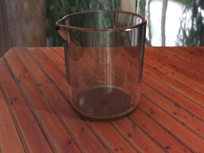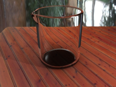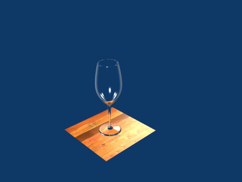 Luego hay que tomar en consideración el material, no basta con bajar el alpha casi a cero, hay que crear texturas para los canales de especulares, Bump, reflexión y difuso para añadir ralladuras, imperfecciones y zonas más opacas o con polvo o humedad dependiendo del caso. Ese material debe tener bien configurado el IOR (índice de refracción) según el tipo de cristal que quieras representar. Si la copa contiene líquido pues tendrás que configurar el material de éste para que se comporte como es debido frente a la luz. Necesitas un motor que pueda representar cáusticas, tipo Yafray o LuxRender, por nombrar los primeros que me vienen a la mente.