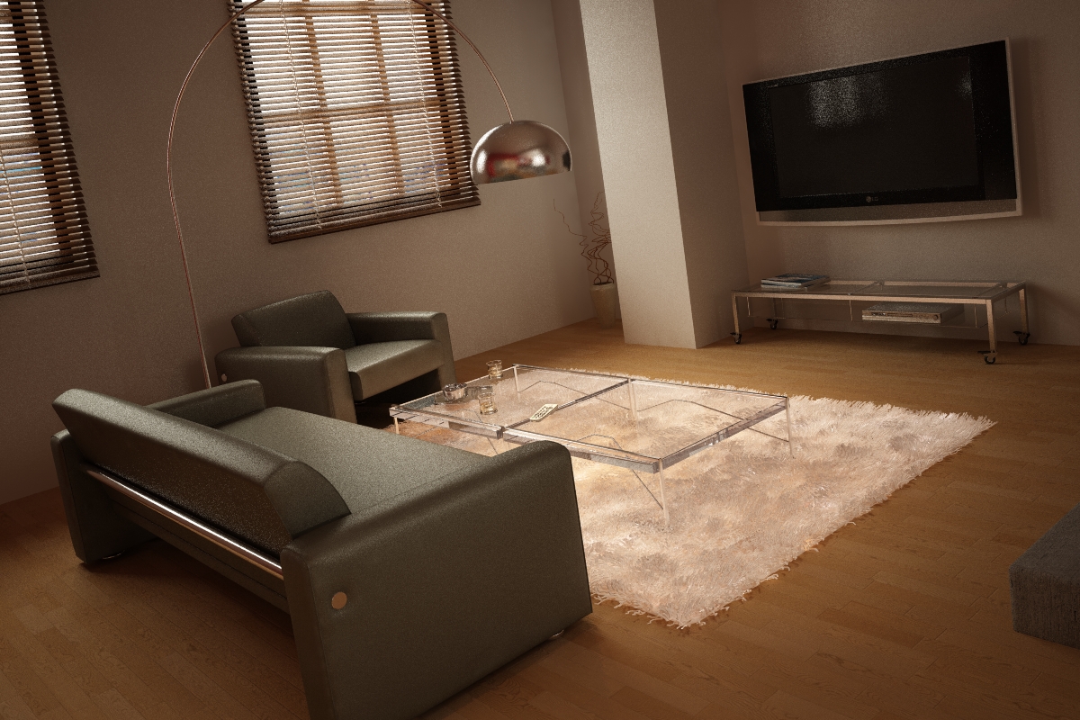 Hola, tienes que cuidar las subdivisiones de los materiales, los tienes todos con mucho ruido por esto y te echan a perder los renders, coloca zócalos entre suelo y paredes. Y puede que sea un apartamento de lujo, pero alguno de los muebles parecen sacados de un catálogo de Ikea. Vaya, la altura entre salón y cama, es un poco pensar que estamos todo el día ojo avizor, y te levantas con prisa o malamente y te la das fijo, las cosas que veo así a bote pronto.