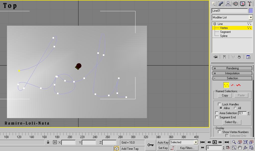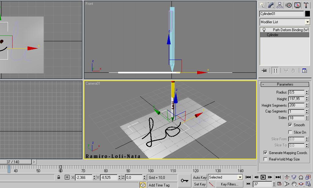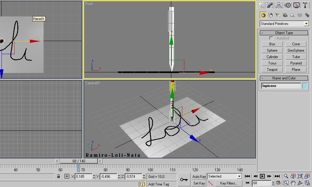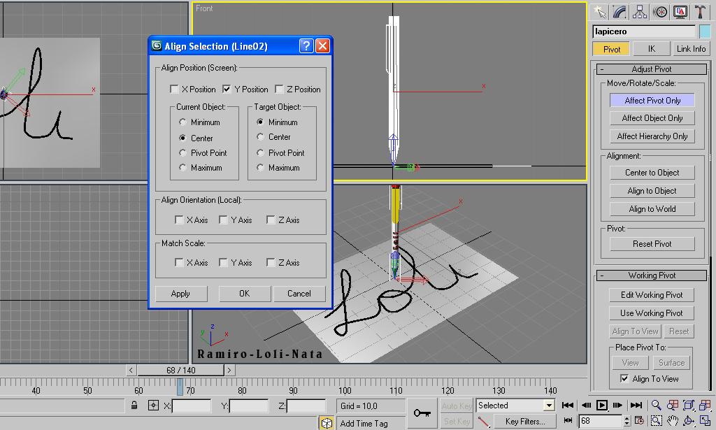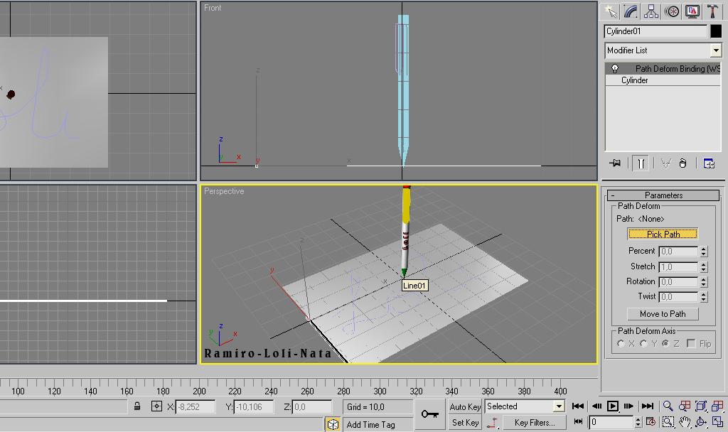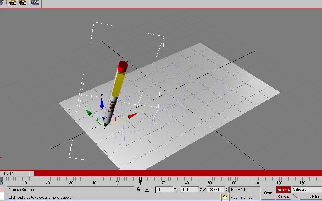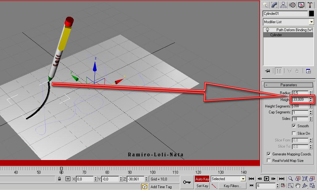 17.- Puede inclinar el lapicero unos 35 grados. Ahora usted observa como el lapicero sigue el mismo recorrido que la escritura, aunque en algunos momentos se retrasa y en otros se adelanta, para sincronizar ambos movimientos, es necesario que nos pongamos en el fotograma cero 0, y apretemos en auto key.