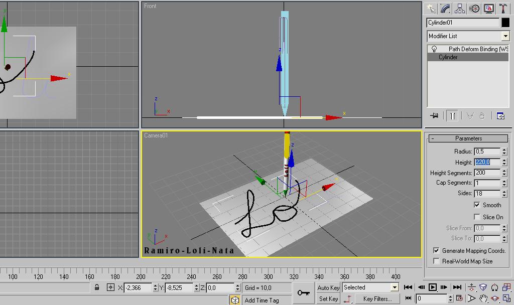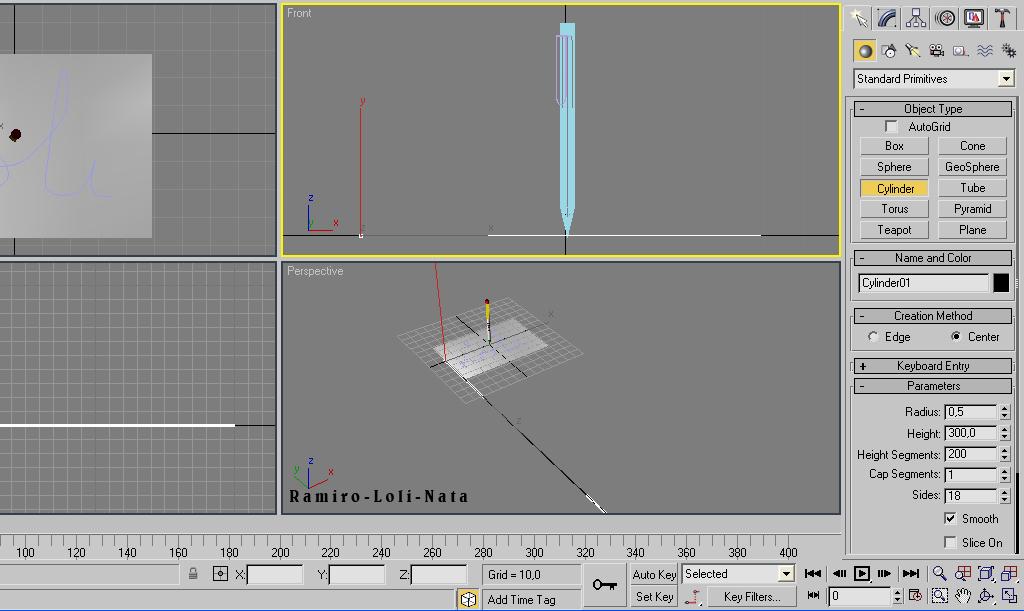 2.- En la vista front cree un cylinder con un Radius de 0,5, height 300, height segments 200, y lo demás lo dejan como viene.