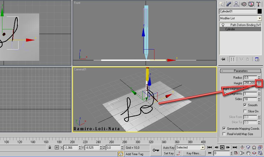 3.- Seleccione el cylinder y en la persiana de modificadores haga un click en el modificador Path Deform (wsm).