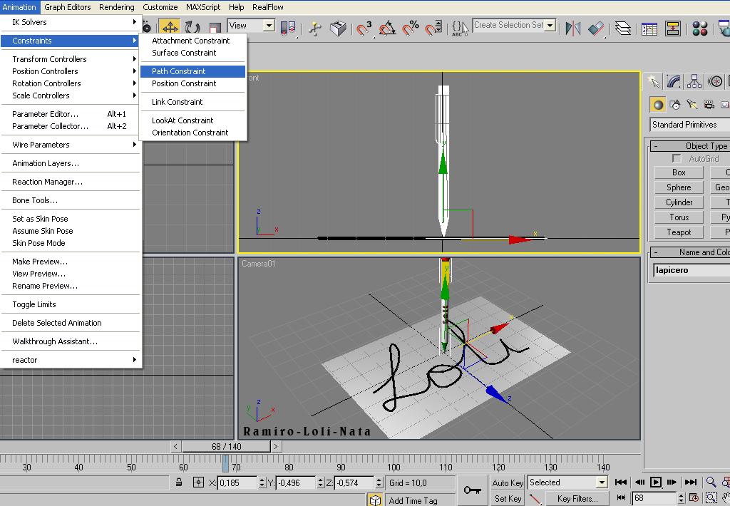 15.- Ahora seleccione el lápiz o lapicero y vaya hasta la persiana superior y elija animation y sucesivamente seleccione constraints y Path constraint.