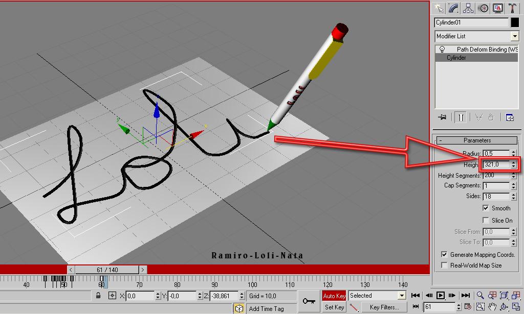 10.- Ahora animaremos la escritura, primero nos colocamos en el fotograma cero 0, y presionamos en el botón auto key, anotamos el valor de height (321) para recordarnos más adelante, luego en la persiana parameters en height, ponemos el contador en cero 0.