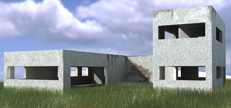 He empezado a darme cuenta que esto del 3d no es solo plantar fotografías tipo caja en la malla guarrilla del AutoCAD, defecto profesional, y bueno he empezado esta casa, la intención es que, al final parezca abandonada, pero el resultado no es importante, es la primera vez que modelo desde max, vaya con la malla poli editable, la primera vez que utilizo el Unwrap, la primera vez que pinto texturas con el Painter, la primera hierba más o menos decente, vaya que me estoy desvirgando, el Vray ya lo he toqueteado alguna vez, gracias Dideje y compañía.