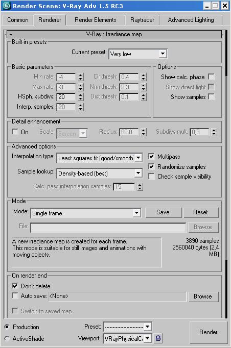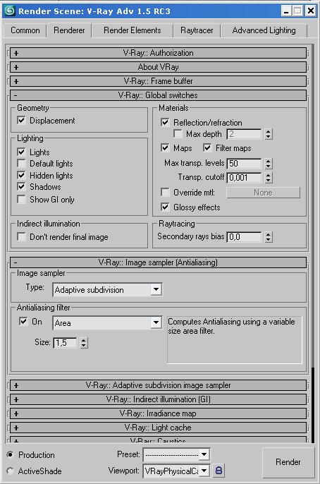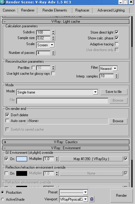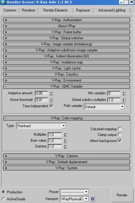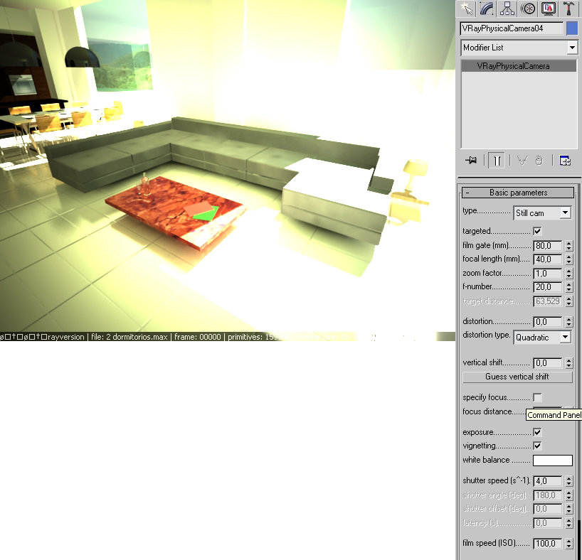 Les adjunto unas imágenes de los renders con diferentes setteos de la Physical Camera que me están saliendo ahora, más las configuraciones del Vray.