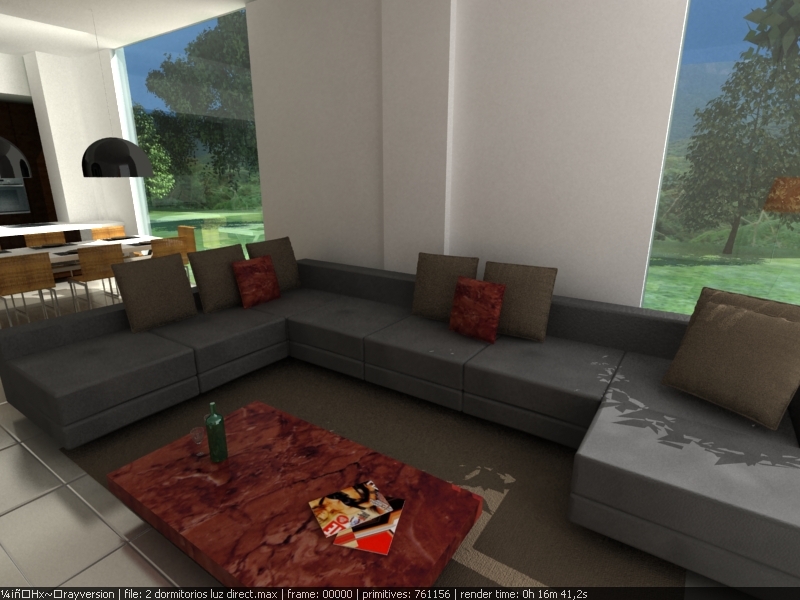 Hay más cosas como l encuadre de la cámara y el modelado que le faltan detalles, unas vntanas con Marcos y cortinas o estores, los detalles dn realidad a nuestros renders. El césped hasta el infinito no ayuda mucho tampoco. Un saludo.