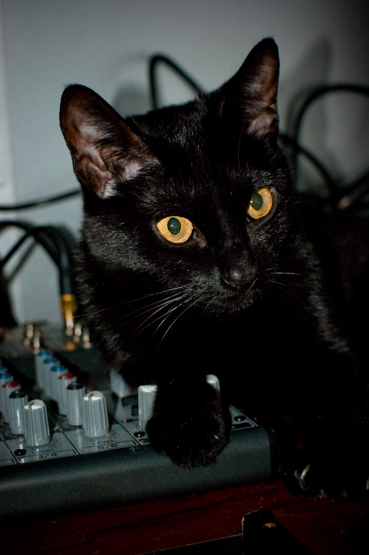 Esta es Lara, que, no sé si será masoca o qué, pero ahora le ha dado por acostarse sobre los potenciómetros el mezclador de audio, con lo incómodo que debe ser.