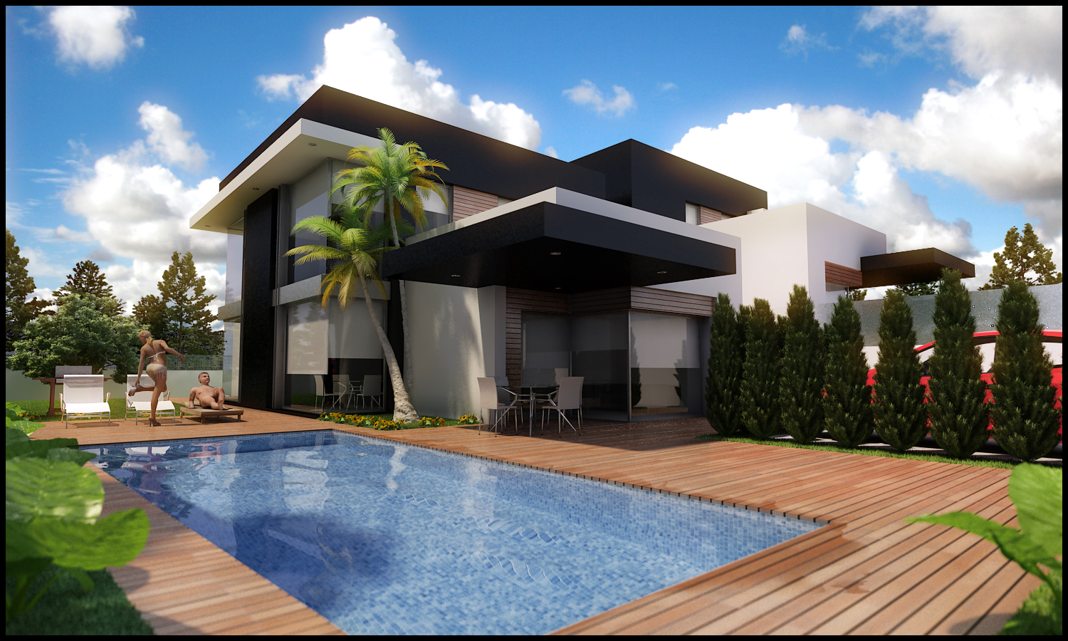 Y en las imágenes restantes, aparte de lo que ya te ha observado sui de las verticales y del mapeado de las texturas (como te observa Susipol del pasto y deck), los pinos que has colocado, son todos iguales, escalados a distinto tamaño. Rotalos un poco, para que se vean un poco diferentes.
