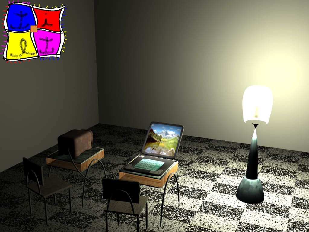 Si nos centramos en la escena, lo que yo intentaría mejorar, así a grandes rasgos, sería lo de las normales de la lámpara que comentaba Cristina, la textura del suelo que queda un poco extraña, y activaría las sombras en las luces, ya que si no, los muebles parecen flotar en el aire. Intentaría dar una iluminación más uniforme a la escena, y vestir un poco las paredes, con posters, un tablón de anuncios, lo que se te ocurra.