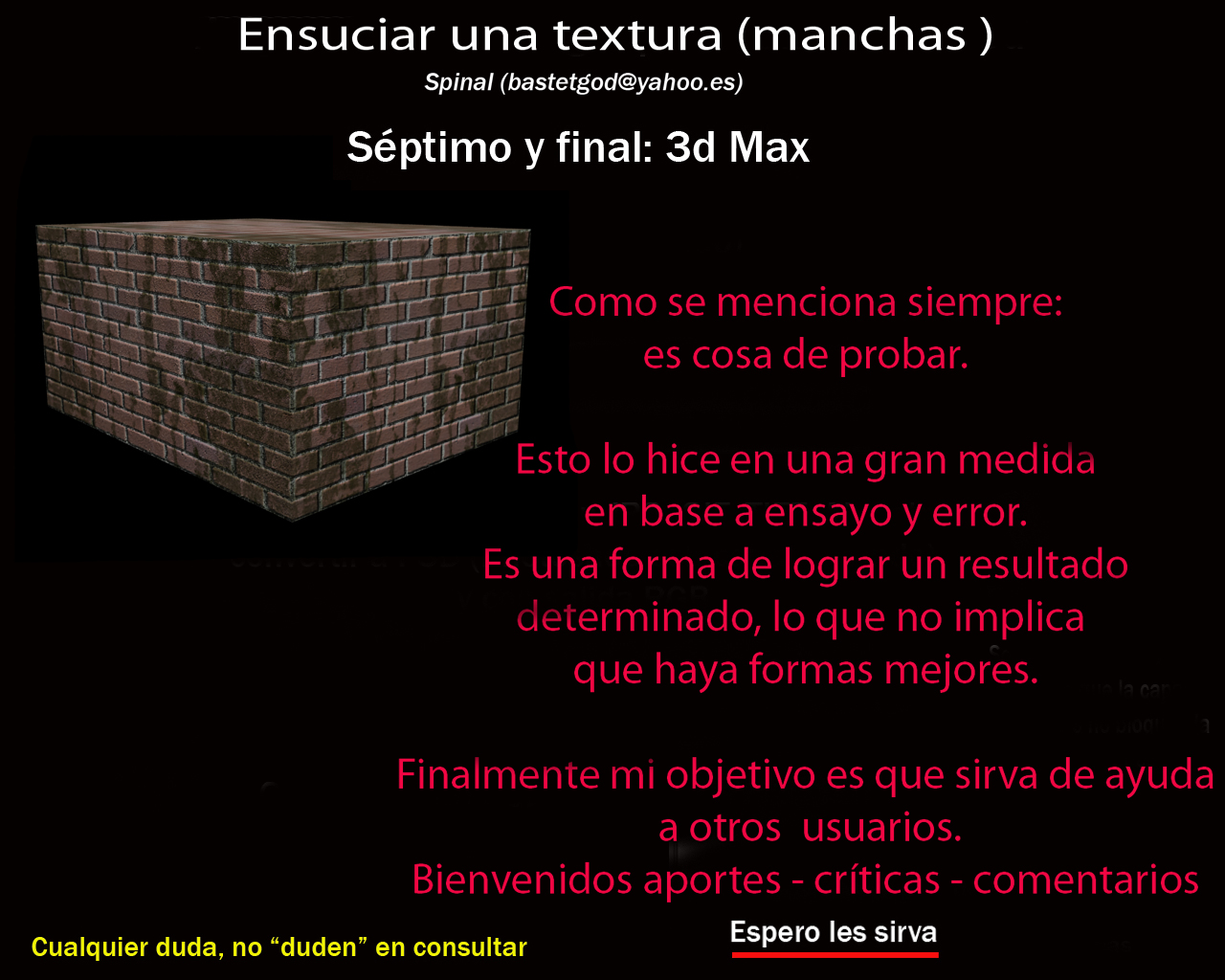 Hola gente: Aquí está una forma de ensuciar una textura. Espero que sirva de contribución y bueno, si alguien quiere proponer, criticar o algo, todo bienvenido.