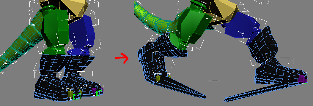 Hola, prueba esto: selecciona la malla y dentro del modificador Physique selecciona vertex. En vertex operations pulsa el botón select y selecciona en el visor los vértices de la malla que no se comporten como tú esperabas. A continuación pulsa remove from enlace y después assing todo enlace y selecciona en el visor el enlace del Physique (el hilo amarillo que atraviesa el Biped, las distintas partes están separadas por una especie de asteriscos) correspondiente a la parte del cuerpo con la que deberían moverse esos vértices, en este caso me imagino que el pie (fot) o los dedos del pie (toe). Lo más probable es que ya funcione a tu gusto. Prueba y me cuentas.