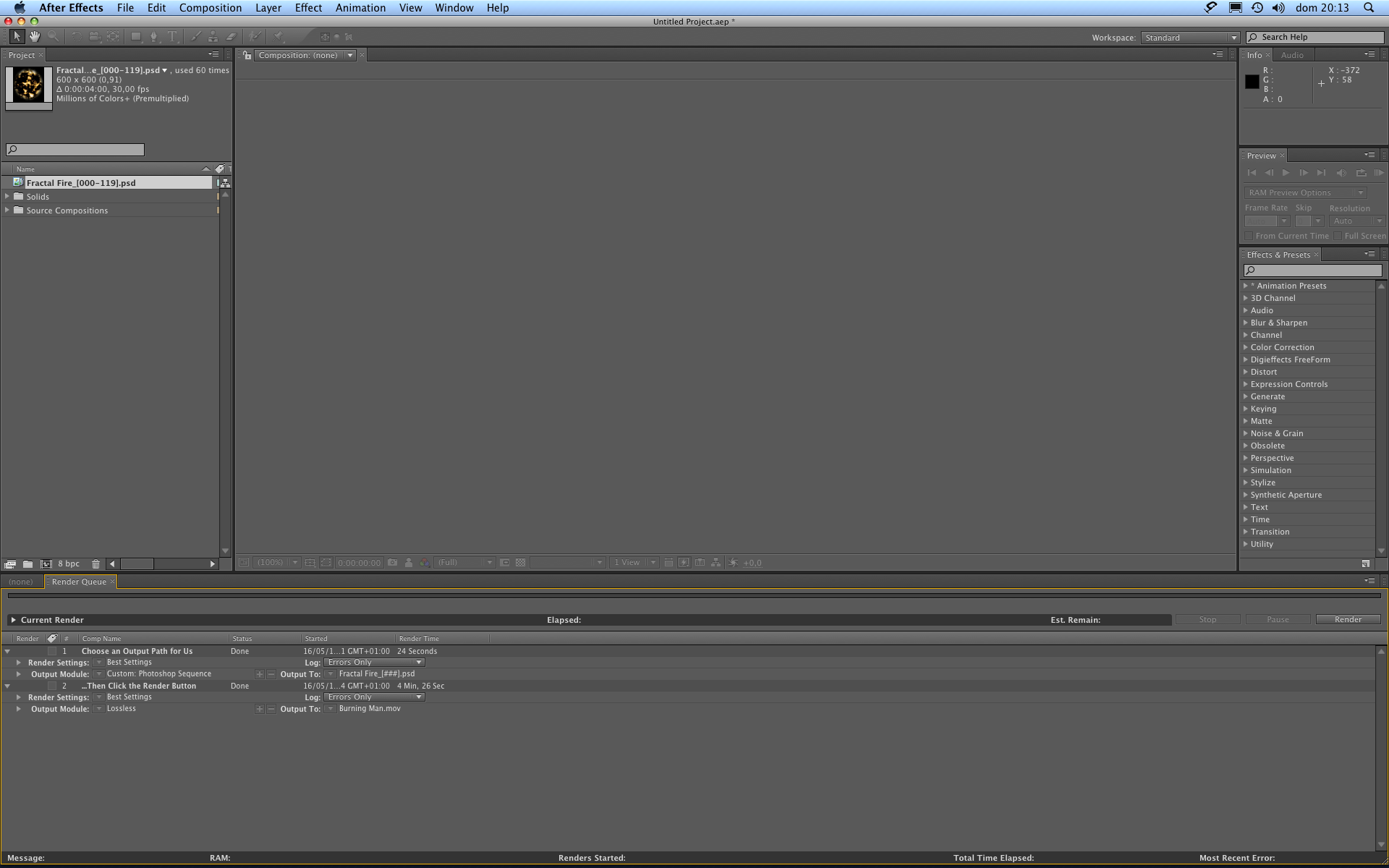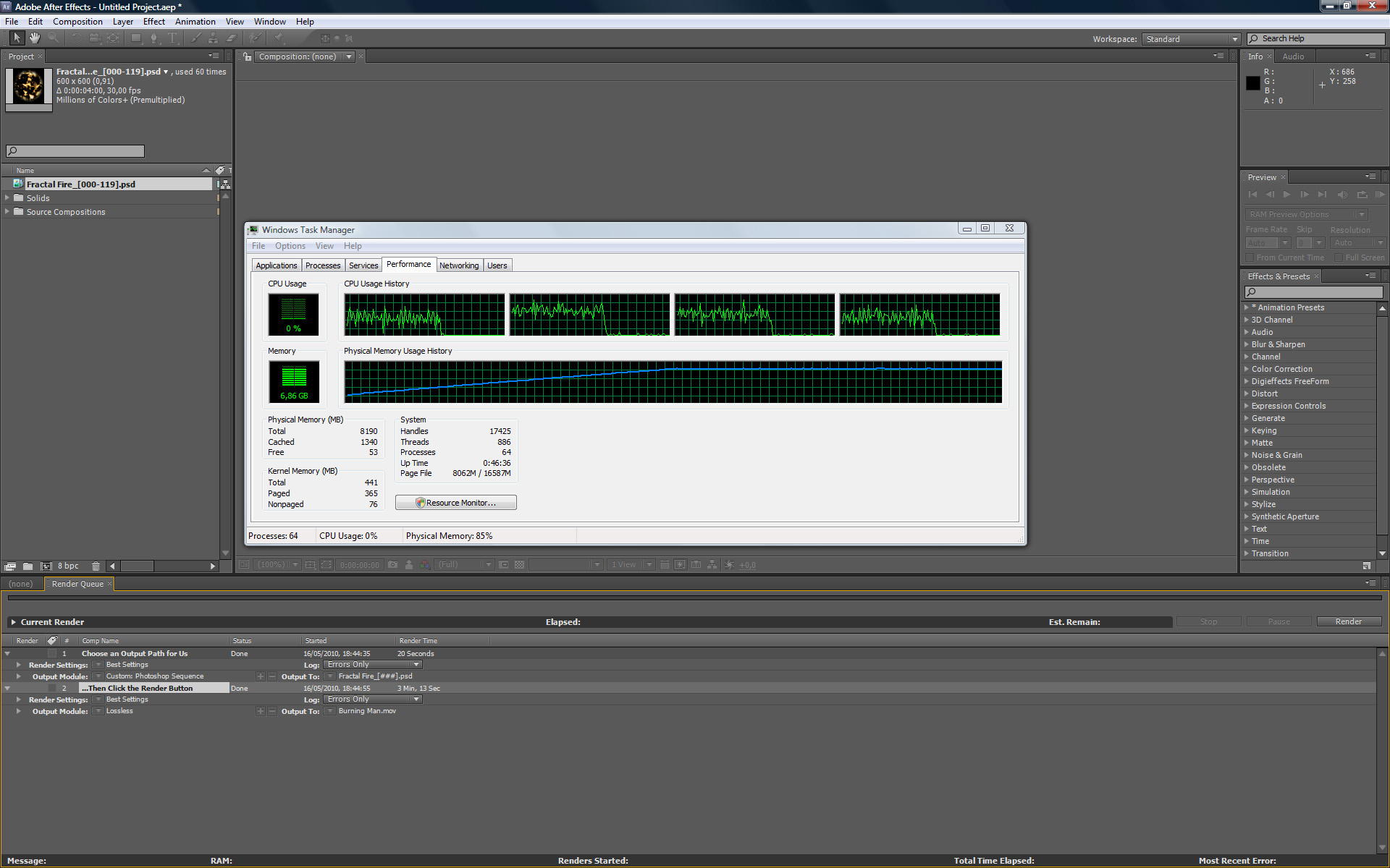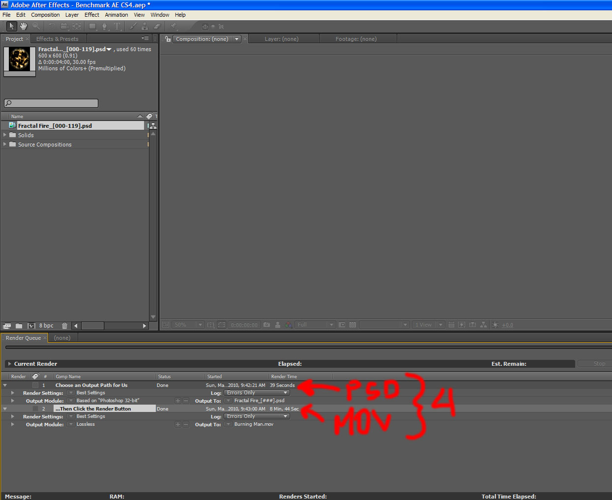 De ser posible pongan los resultados de los tiempos de renders de la secuencia psd y del mov, además de los datos del PC/Mac que estén usando: