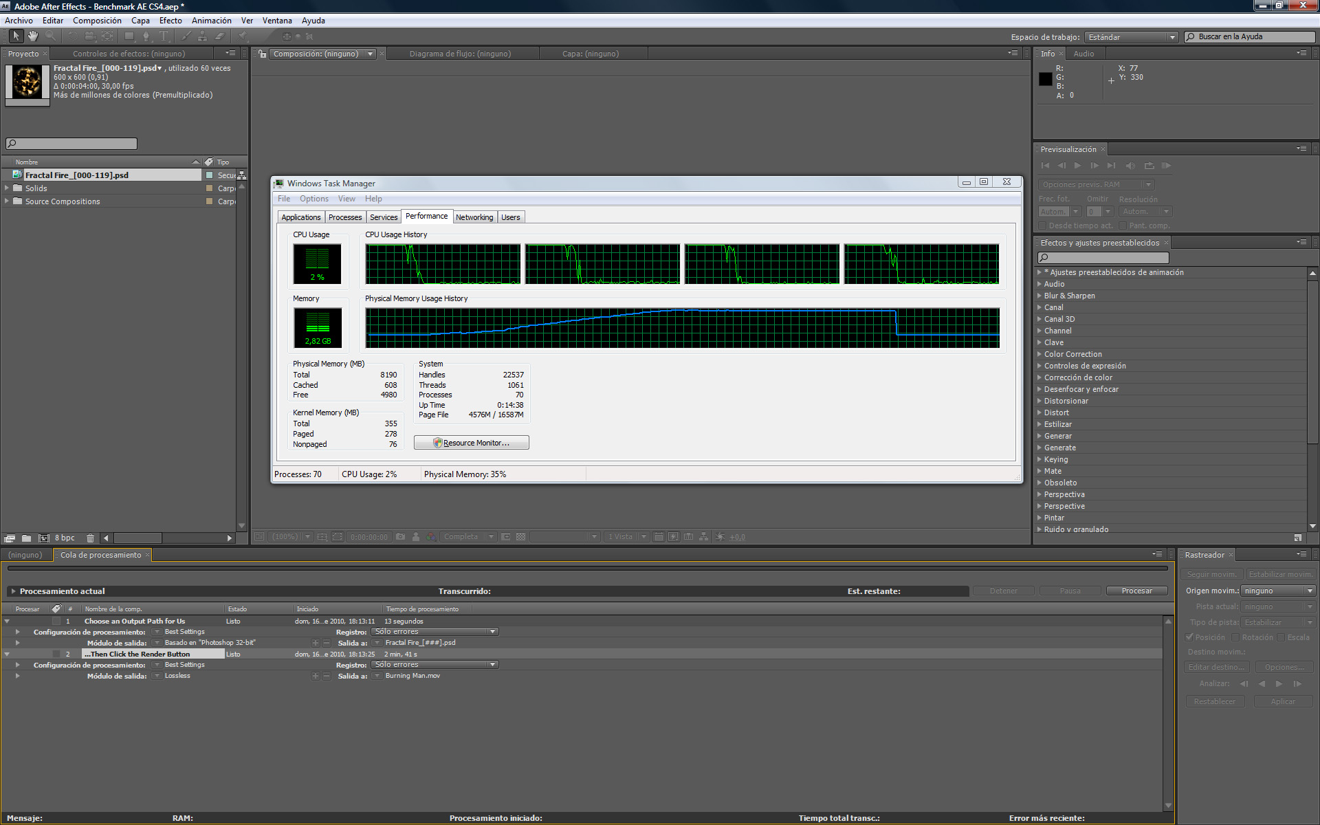 Q9550 (2,8 Ghz @ 3,6 Ghz) 8 Gb DR2 840 Mhz, vista64 After Effects cs5, Adobe After Effects cs5 (da un aviso al abrir el archivo para convertir a la nueva versión. Durante el render usa menos CPU que en CS4, posiblemente sea la causa del peor resultado).