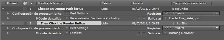Hola Cabfl recién he bajado el fichero y lo he abierto y ahí están todas las comps y los renders listos para ser lanzados, solamente hay que cambiar la dirección de a donde va el fichero para una carpetica en la que el pueda hecharlos y no se te arme el despelote en el escritorio.