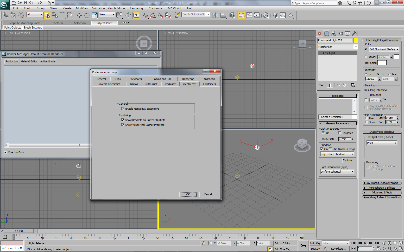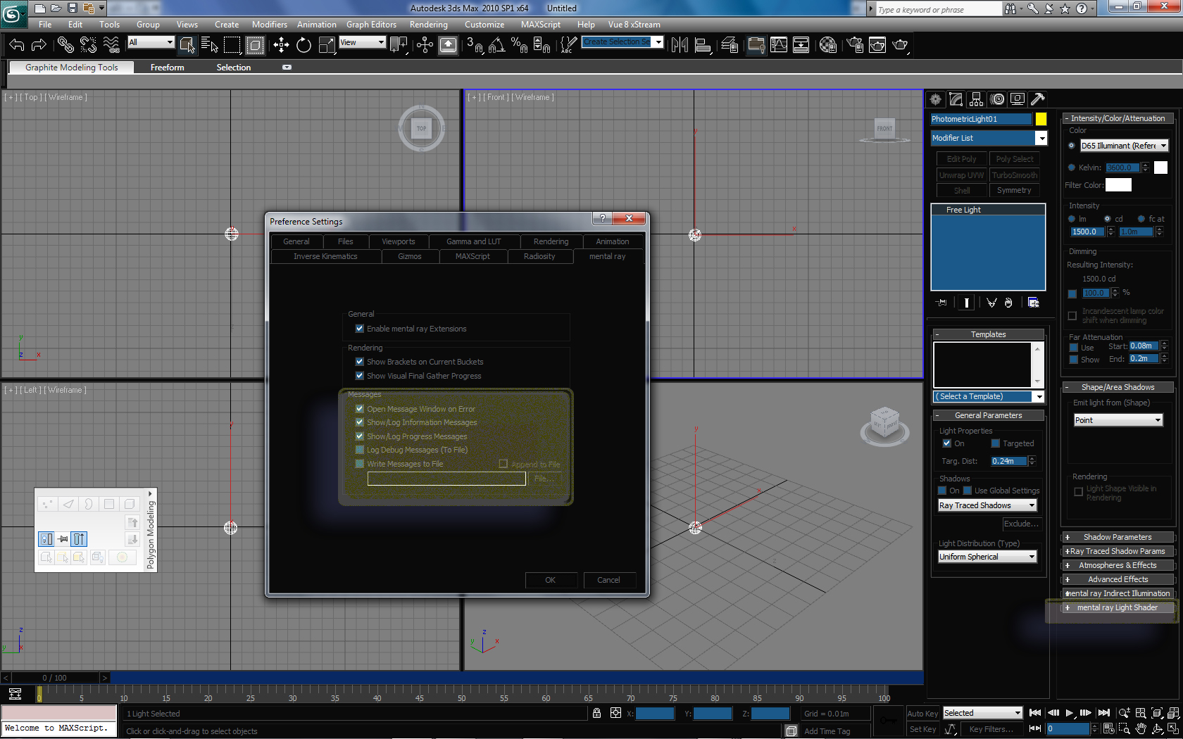 No me aparece Mental Ray light Shader ut cuando selecciono alguna luz. Tengo activado enable Mental Ray extensiones en customize, preference, Mental Ray, en el cual tampoco salen las opciones para messages.