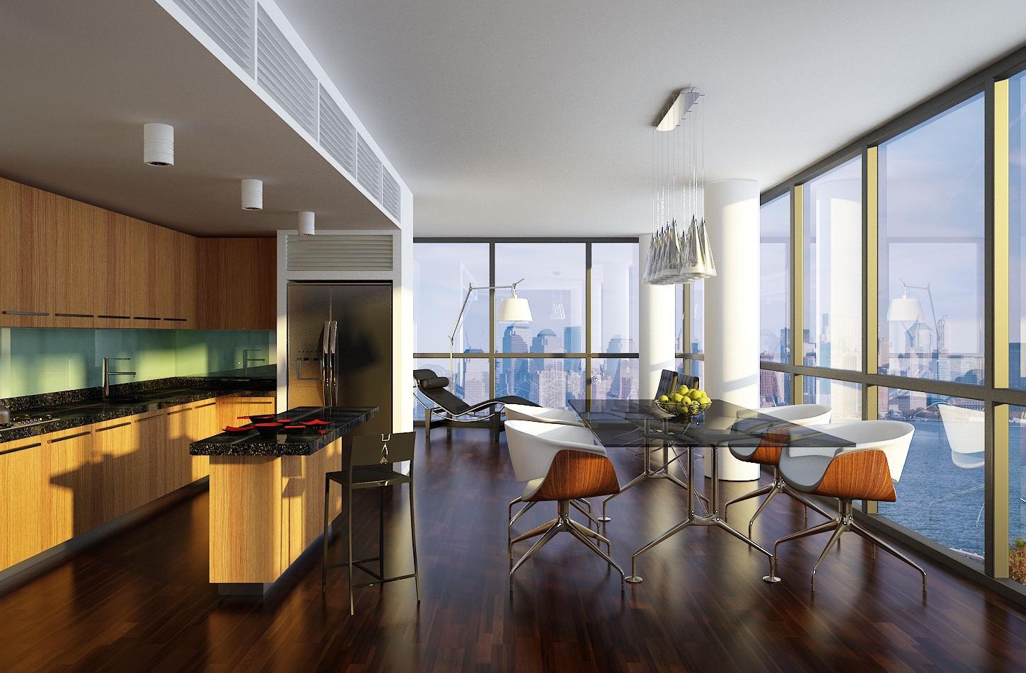 Por otro lado, mejoraría las texturas metálicas, tanto de carpintería como de luminarias en general, y la textura de piel de los asientos, que se ven demasiado planas. Por otro lado, creo que la textura de madera del mueble de la cocina también podría mejorar, y ya que ocupa gran superficie en la escena ese cambio repercutiría notablemente en la escena. Un saludo.