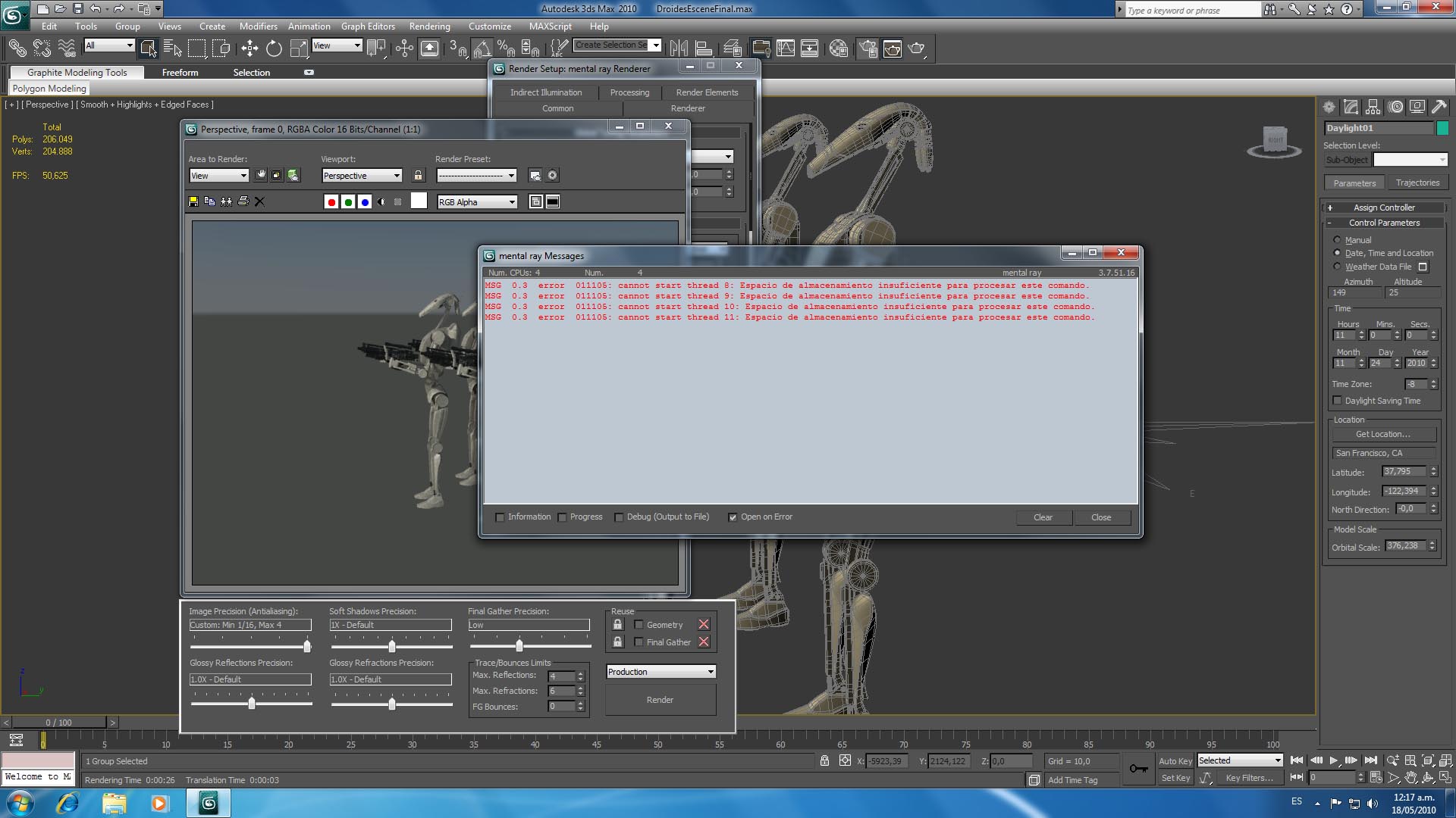 Otra cosa el render que he tirado se tiro con bajo antialiasing y con bajo finalgater en Low, buen si es posible que sean muchos los polígonos? Es que quiero hacer una escena en formación con estos droides más un paisaje atrás o algo que represente quizá una batalla, pido mucho al programa? No se quizá también he pensado hacer algo de paisaje en el Vue y después pasar los objetosdroides al programa ese para renderizar o al revés, quizá pasar el paisaje al max y renderizar ahí, algún consejo que me puedan dar ustedes que de seguro tiene más experiencia en renders? Saludos cordiales.