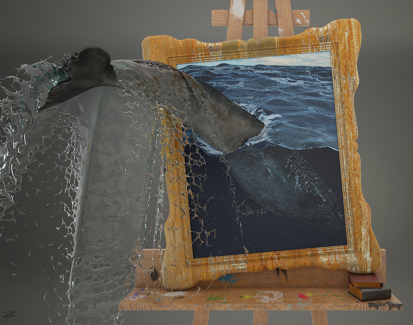 Bueno, el concepto esta estupendamente original, me gusta muchísimo y da otro enfoque, eso es arte en concepto, el trabajo de modelado y texturizado me parece muy bueno, aunque le encuentro rara las texturas del marco, sé que deseas darle apariencia de madera vieja, pero, no se me da la impresión de que más que madera es otro el compuesto del marco. Y las partes doradas, pues las veo bien, aunque son muy pocas y algunas deberían estar medías opacas, aunque esos son puntos banales. Pero donde si veo una pega total, es en el agua que bota la ballena de la cola, o que tiene en esta. Ya que más que agua pareciera algún compuesto mucho más denso, como vidrio derretido en proceso de secado, ya que parece más una capa seca de barniz encima de la cola que agua. Bueno eso es todo.