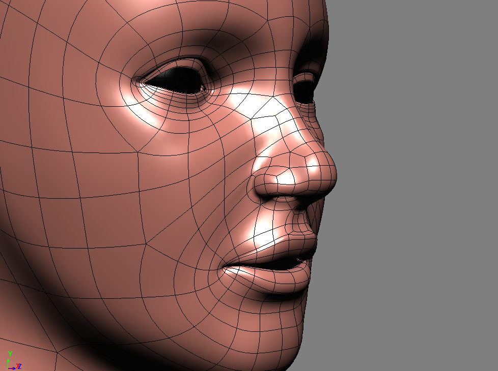 Otro detalle en el que me he fijado, es que en muchos vídeos que he visto por ahí por YouTube, cuando se empieza a modelar, se queda un loop que recoge los bordes de los labios, además del exterior que recoge la nariz entera y los labios completos. Si te fijas en la imagen del tutorial, este primer loop falta. Creo que el problena nace de la forma en que comienzas a crear el modelo. Yo empecé, por ejemplo, a partir de una caja dividida en 6 lados a lo alto (vista frontal), 4 lados a lo ancho (vista frontal) y 3 al lateral (vista derecha). Desde esa estructura básica, fui sacando los loops y los huecos de los ojos, nariz y boca, eliminando polígonos y extruyendo aristas. Para la siguiente cara, voy a empezar como viene en la imagen del tutorial ése que has enlazando. Así podré asegurarme de que los loops están en el lugar correcto desde el principio.