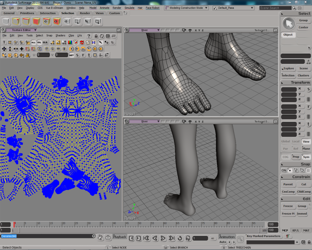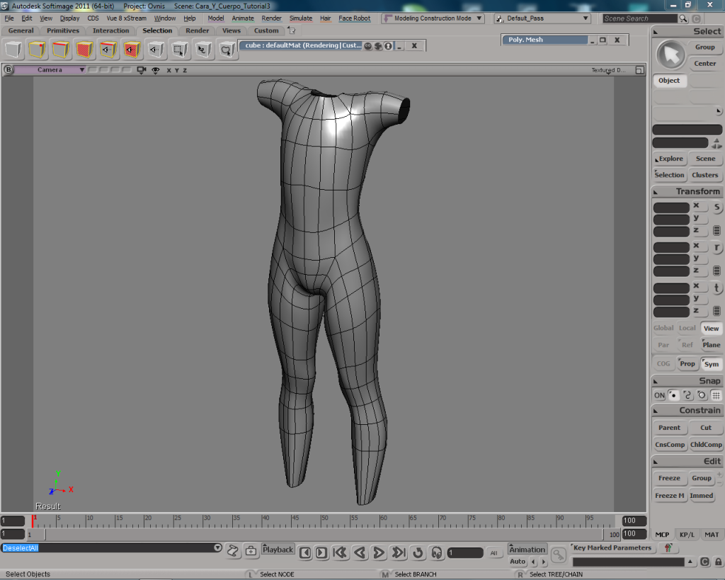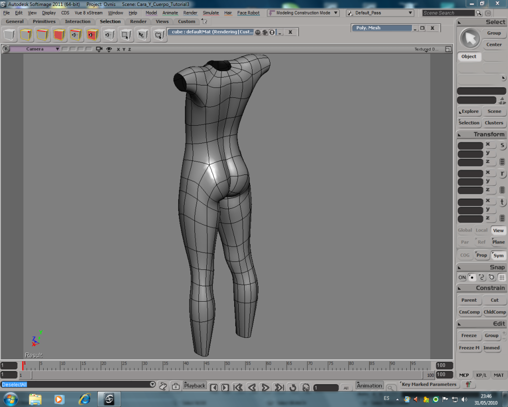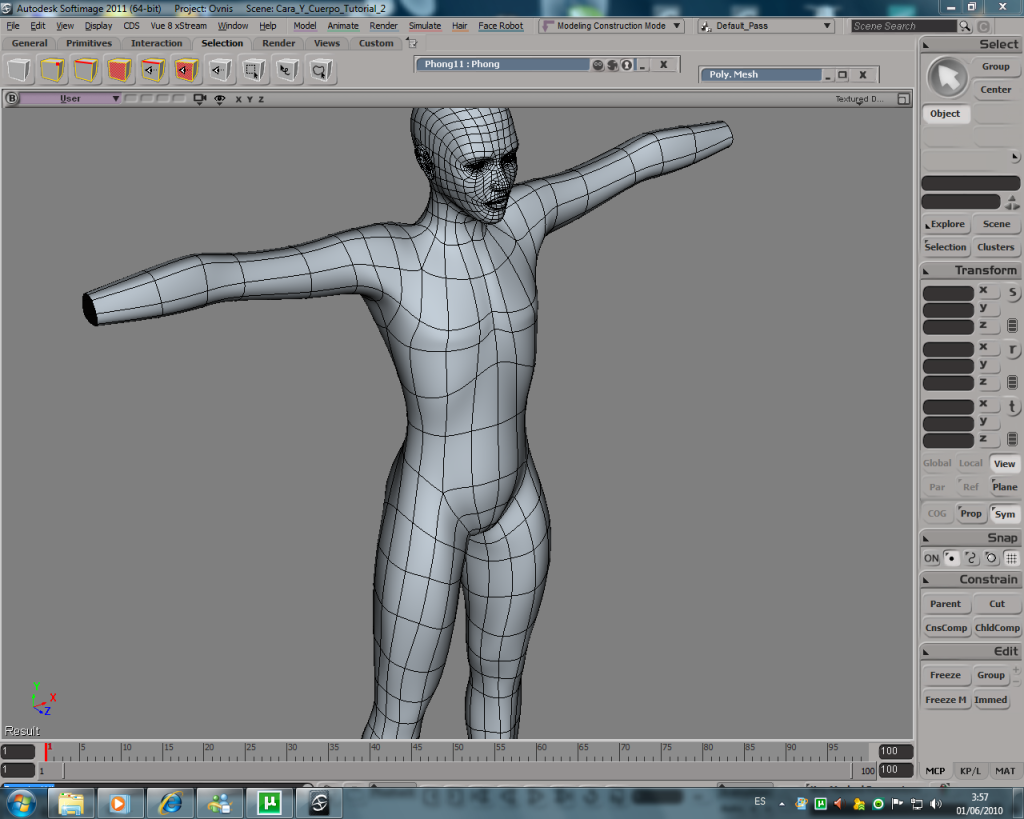 Aquí dejo algunos wires sobre un modelo de cuerpo entero que estoy intentando hacer para un tutorial (mientras término una animación). El rostro en verdad, no se parece en nada a las fotografías de referencia que tomé, pero menos da una piedra. Tampoco pretendo que se parezca a nadie en concreto. Lo que me he dado cuenta mientras modelaba, es la cantidad de detalles que hay en el rostro humano. Desde la comisura de los labios, hasta el cierre de los párpados, pasando por los agujeros de la nariz o por el olor a perfume francés. También hay que tener en cuenta cosas como el grado de curvatura de las mejillas, las cejas, la barbilla, la frente y los primeros 10 decimales del número pi. El modelo terminé ayer (hoy me pondré con las orejas) y llevo prácticamente toda la mañana ajustando la malla para darle una sensación más realista. Así que cuando hagáis vuestra cara, tenéis que pensar que ésta no se termina con el último polígono que se pone.