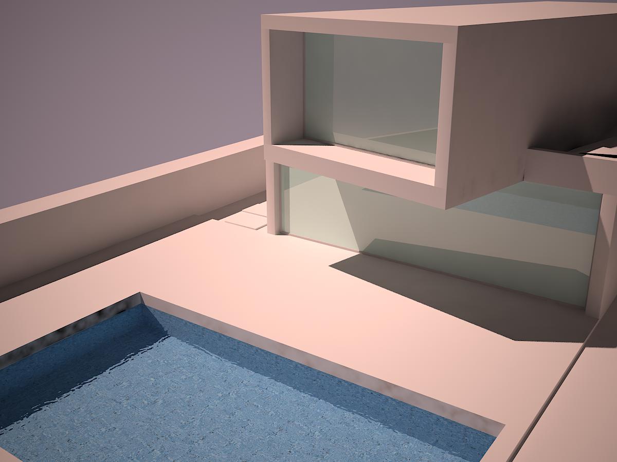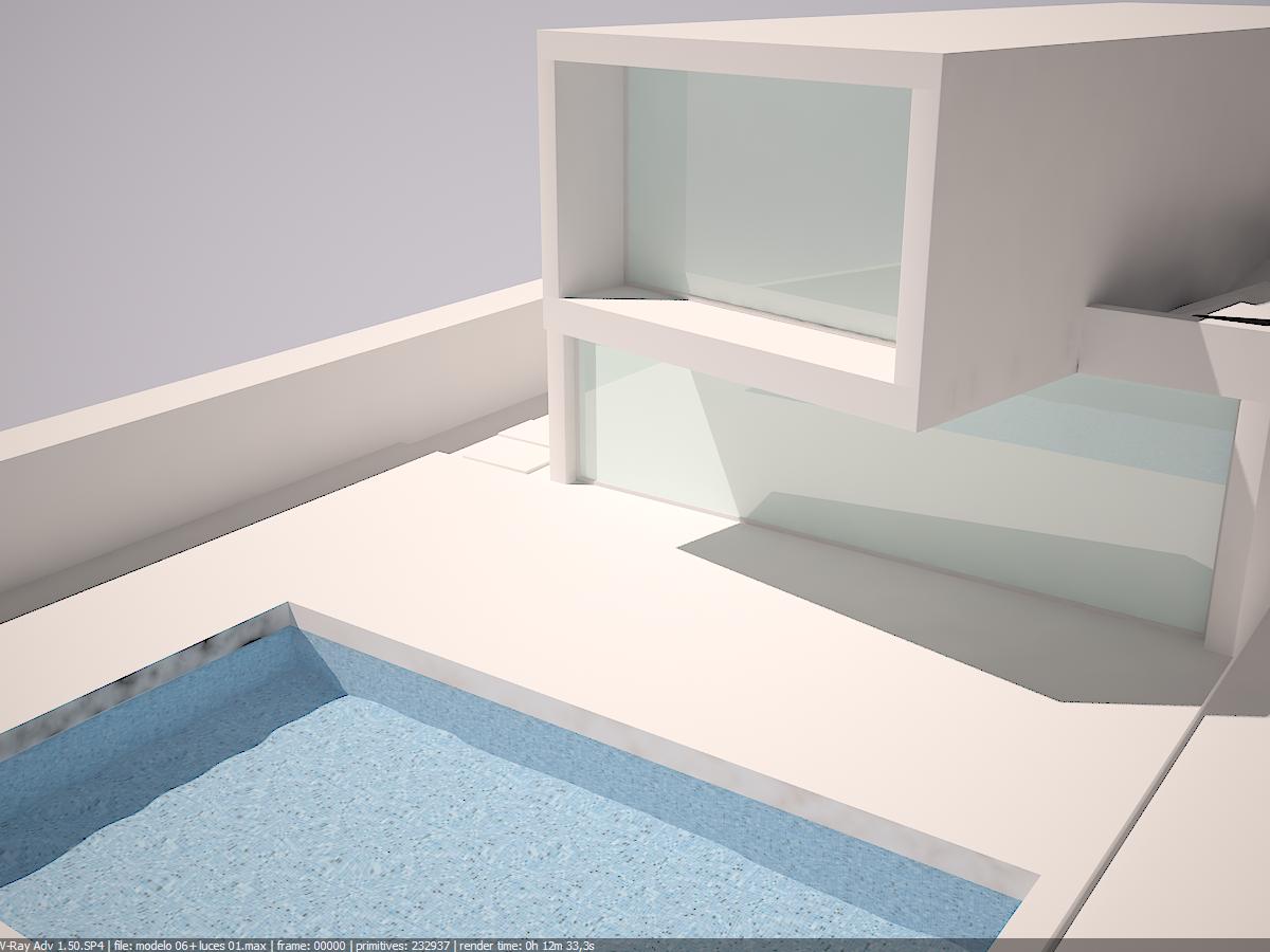 Os voy a dejar una prueba que he hecho, esta si materiales, solo un poco de reflejo en el cristal y el agua de la piscina, pero tengo un montón de preguntas, a ver si alguien me las puede contestar y ayudar, por supuesto.