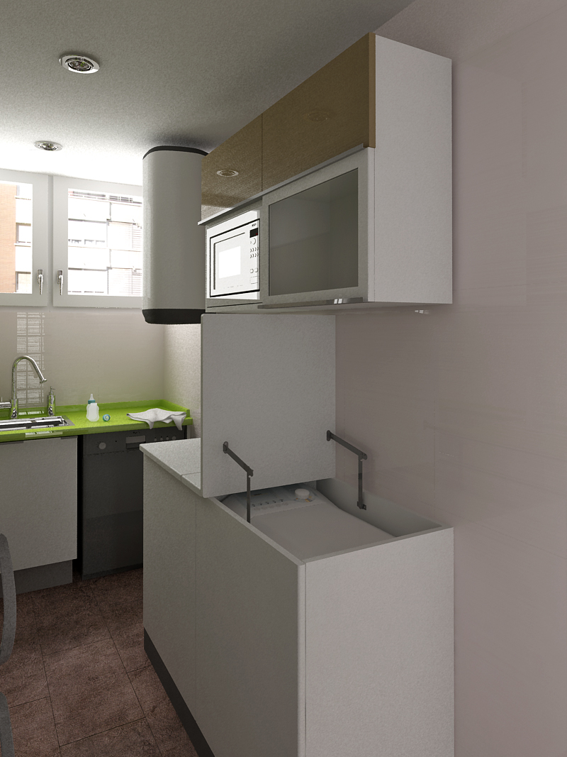 Hola Pola, siento el retraso, pero no estoy en casa estos días y voy un poco a salto de mata. Lo que me faltó el otro día por explicarte es que hice un render con una columna de electrodomésticos junto a la nevera y no nos convenció porque aumentaba la sensación de pasadizo estrecho o de embudo, esa columna se nos echaba encima y además queríamos la mayor superficie de trabajo posible porque siempre tenemos por ahí a mano la batidora, las latas con la leche y los cereales, el escurridor de biberones, ya sabes, todo lo que se necesita para dar de comer un bebé cada 3 horas, por eso buscábamos una solución en la que tuviéramos la mayor parte de encimera posible despejada.