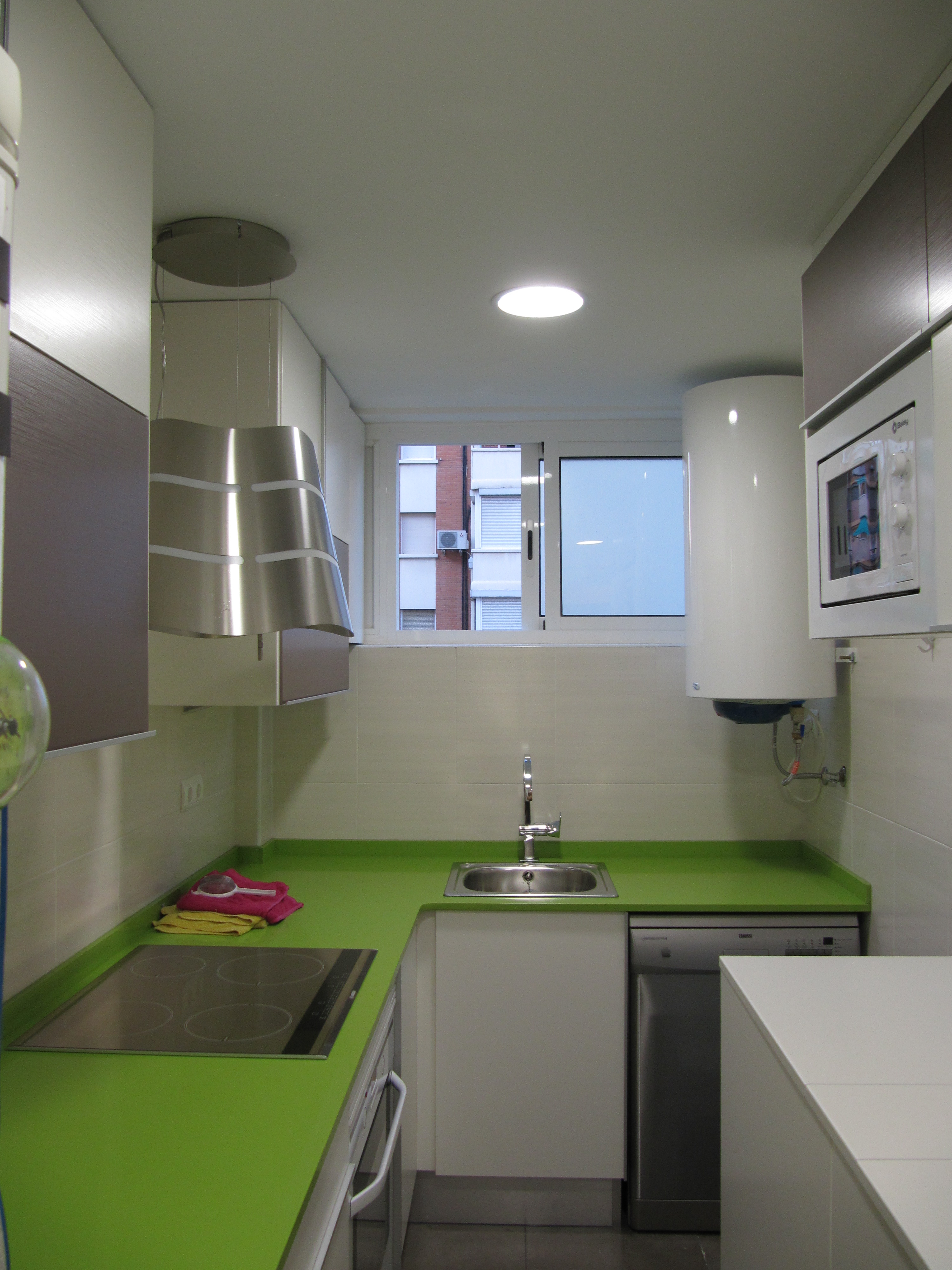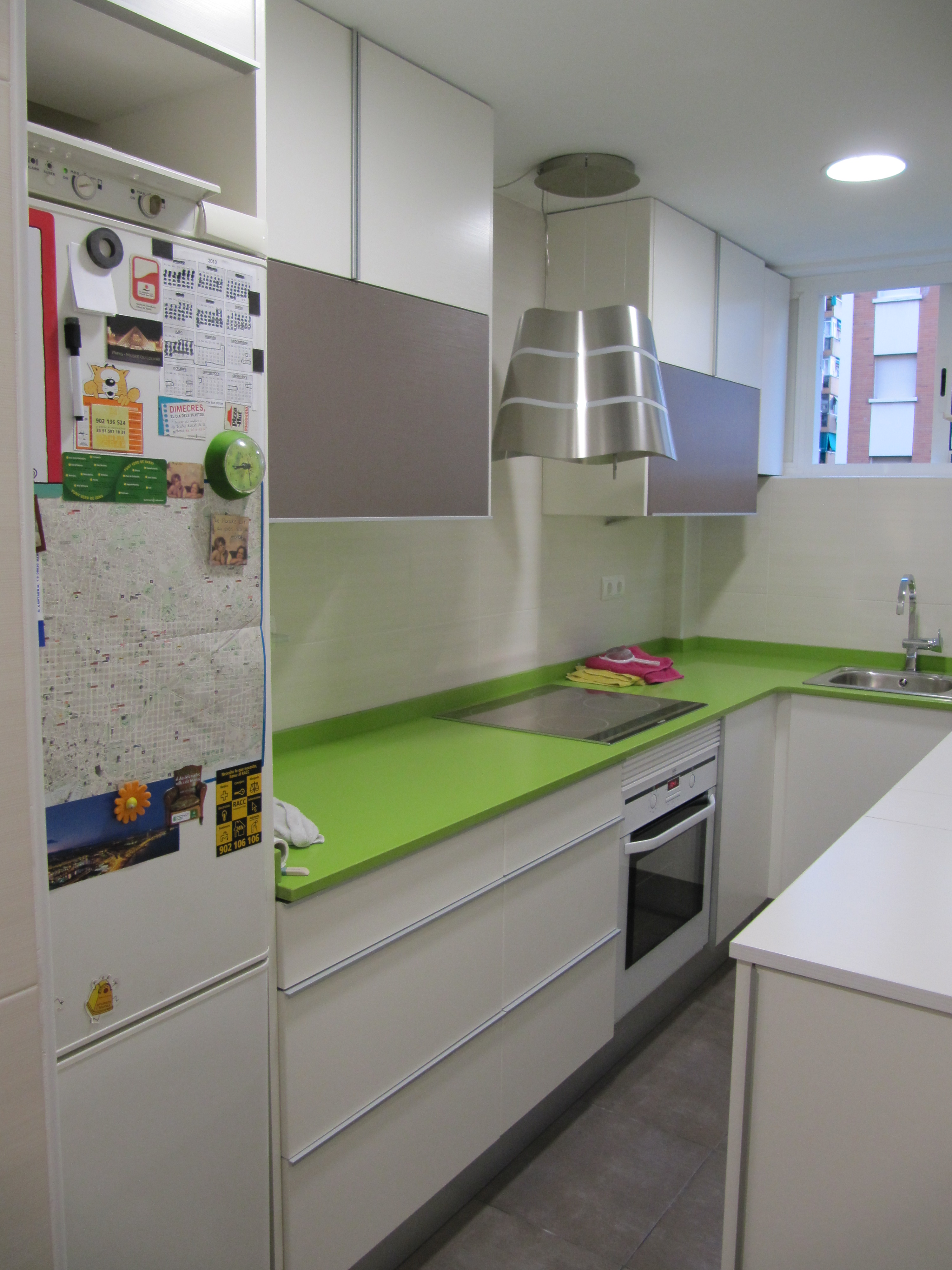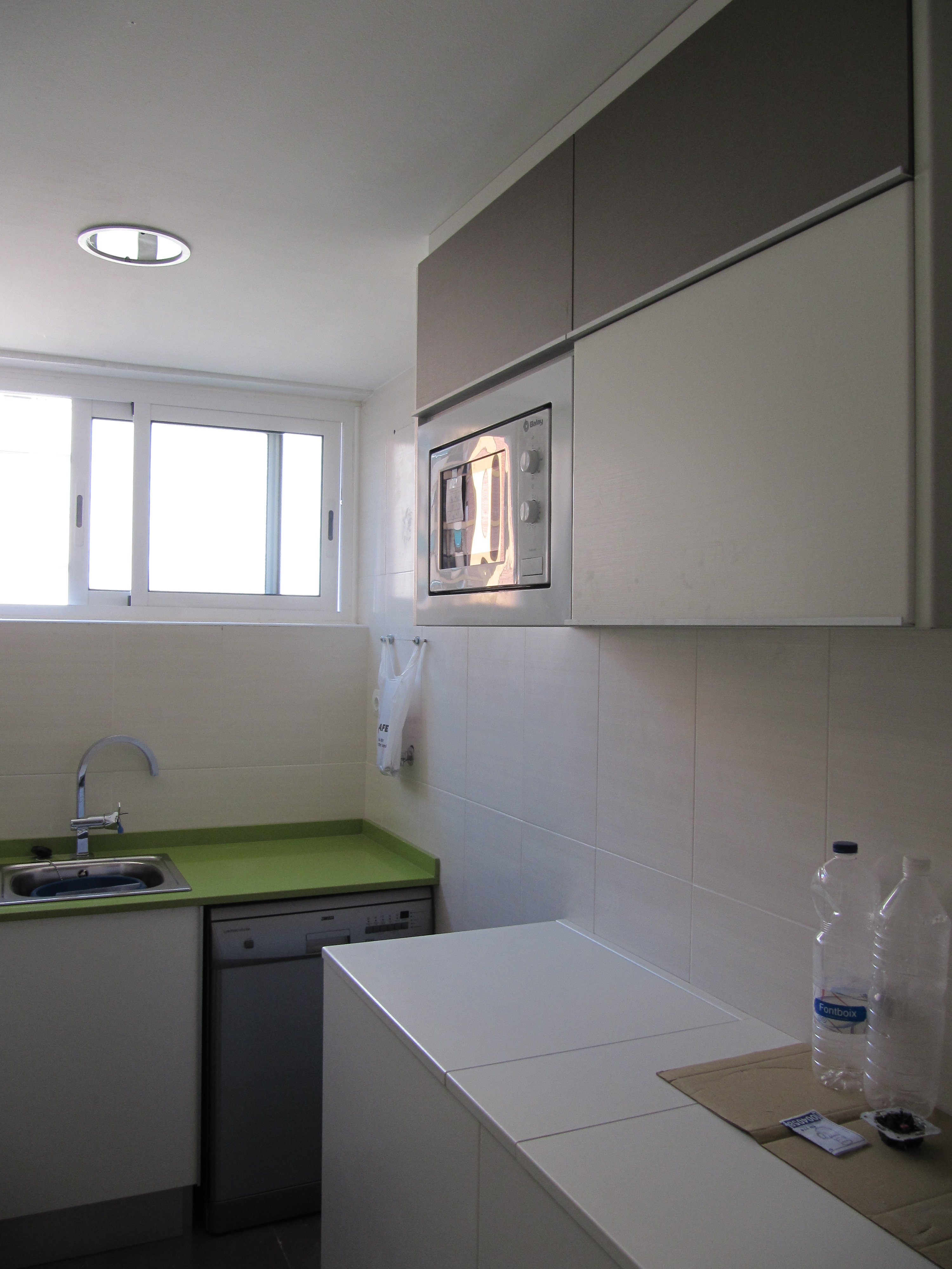 Por difícil de creer que sea, podemos estar dos personas trabajando al mismo tiempo siempre y cuando avisemos cada vez que abrimos una puerta o un cajón (ya tengo una cicatriz en la frente para recordármelo). Lo único que ha fallado para mí gusto son los tiradores. Debería haber puesto uñeros porque los que tenemos son un perfil metálico cortado a medida y los bordes son muy peligrosos. El microondas quedó un poco alto, pero para lo poco que lo usamos nos da lo mismo.