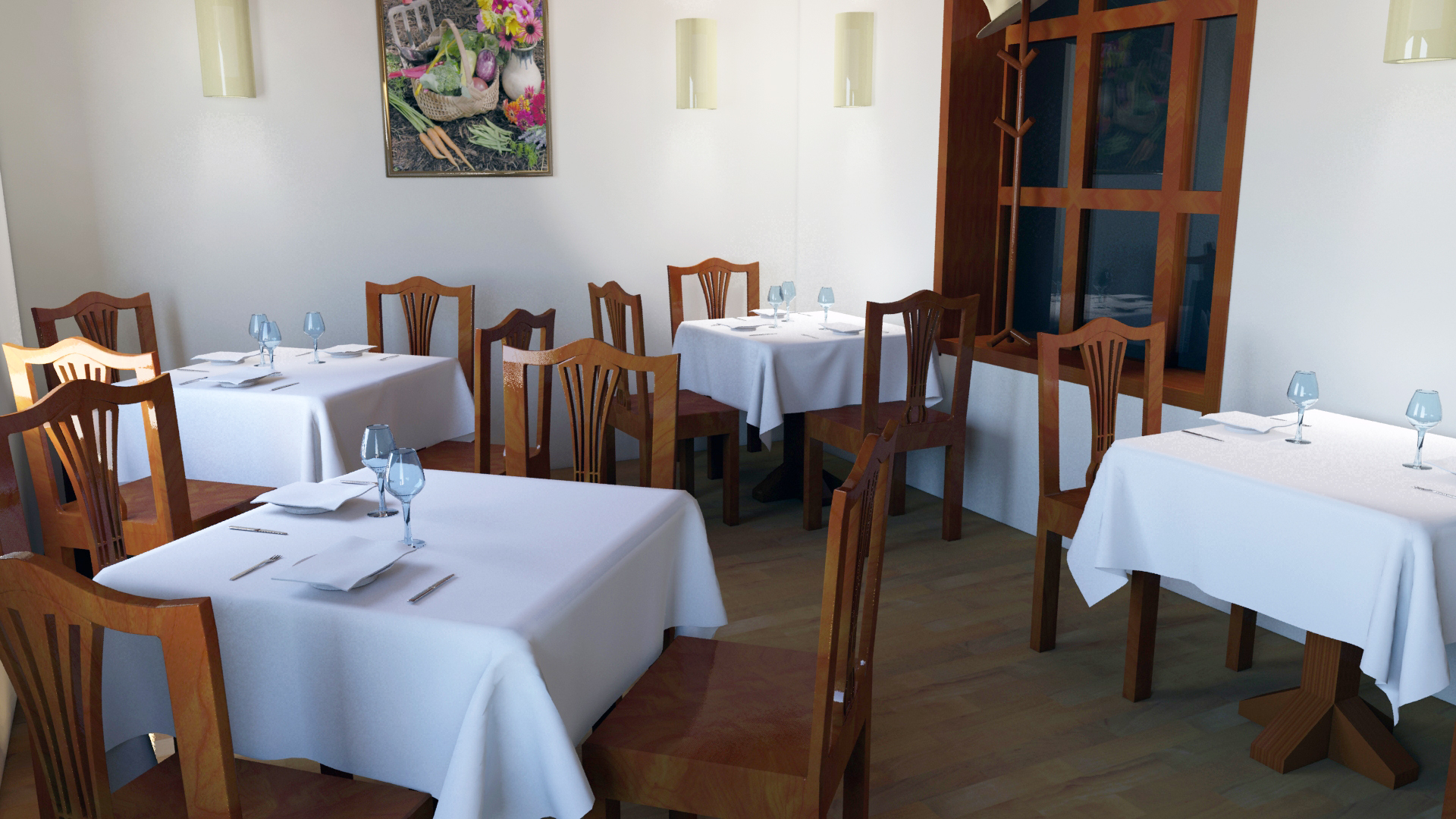 Tiene su mérito este trabajo, y aspectos acertados, pero en este caso, los objetos de madera, por su abundancia y cercanía, adquieren importancia y deben mejorarse. Es normal que los dibujantes de 3d, mapen estos objetos como si fueran una sola pieza, pero en la realidad, las sillas o las ventanas, están compuestos de subobjetos, es decir, no se parte de un tronco de árbol que se va vaciando hasta dejarlo definido. Aparte de que eso sería carísimo, en materiales y elaboración, su estructura duraría muy poco en pié, los simples cambios de humedad y de temperatura, o un golpecito en las partes débiles, arruinarían el invento, ya sé que todos conocemos lo que estoy diciendo, pero, aun así, caemos en la tentación de mapear de un golpe, donde esto queda muy patente, es en el asiento de la silla, que parece una tabla de partir carne, también se nota que las sillas comparten la misma textura, y en el mundo real, no hay dos árboles iguales, si buscas fotorrealismo, debes estar dispuesto a invertir más horas en matizar este aspecto, hay un programa gratuito de creación de texturas de madera,-wod workshop- Que no está mal, no imita a la naturaleza a la perfección, (se pueden editar después, a gusto del artista), pero puedes crear texturas controlando algunas características estéticas y su tamaño, para partir de una textura grande, y repartirla de forma diferente entre los subobjetos. Además, sus contornos coinciden si se repiten, sobre los otros aspectos, mejor que opinen otros, para mí están bastante bien. Saludos.