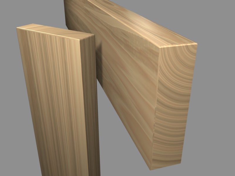 El render, y la posición de la textura, es deficiente, pero lo que pretendo es mostrar es la diferencia entre las caras que muestran las vetas normales y lo que son las testas, en las que lo que se ve son los anillos anuales.