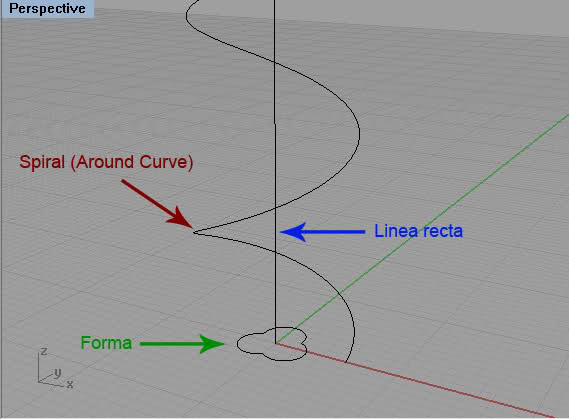 2. Genera una espiral (curve>spiral) con el método around curve y le dices que genere la espiral alrededor de la línea anteriormente creada.