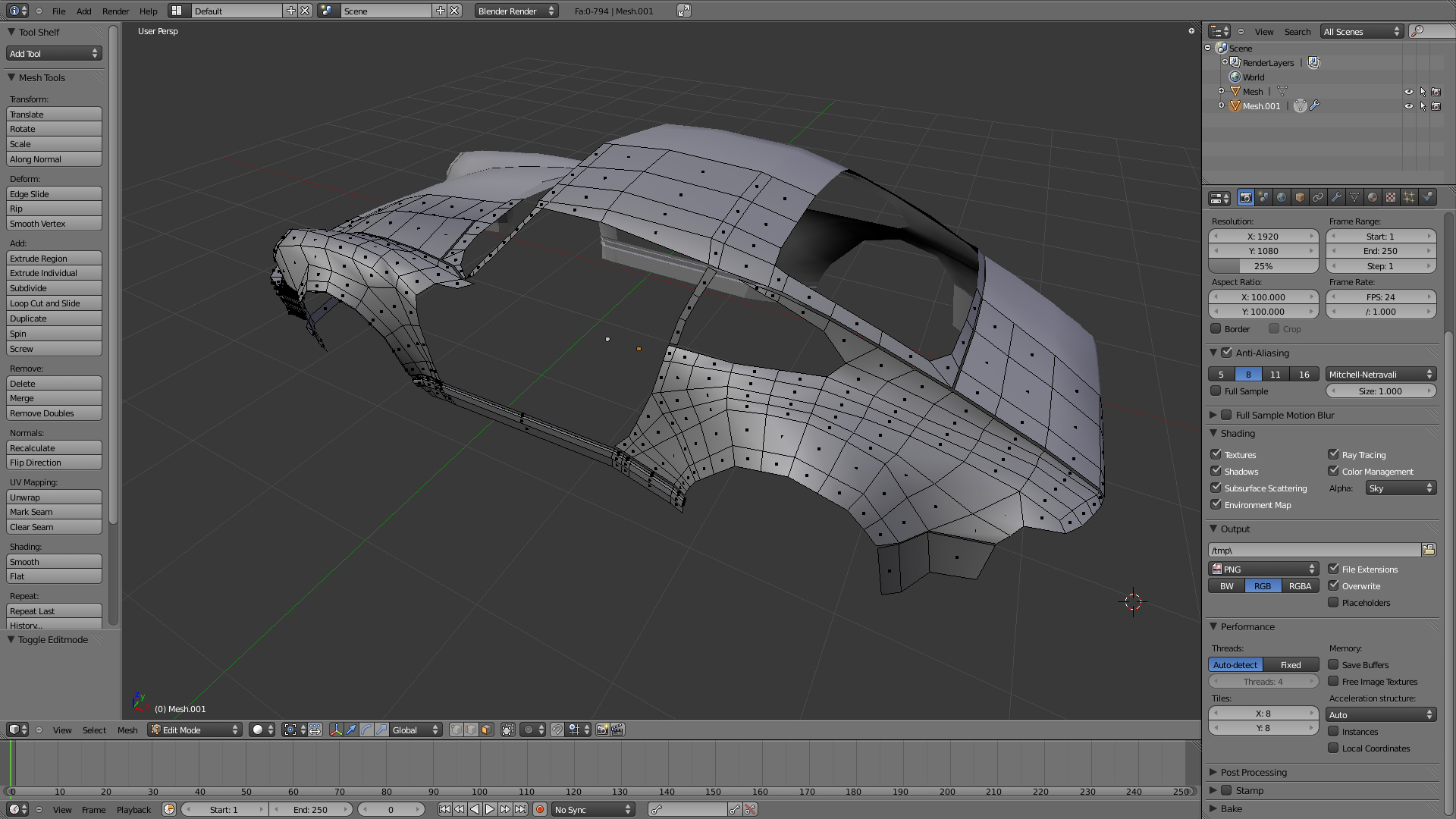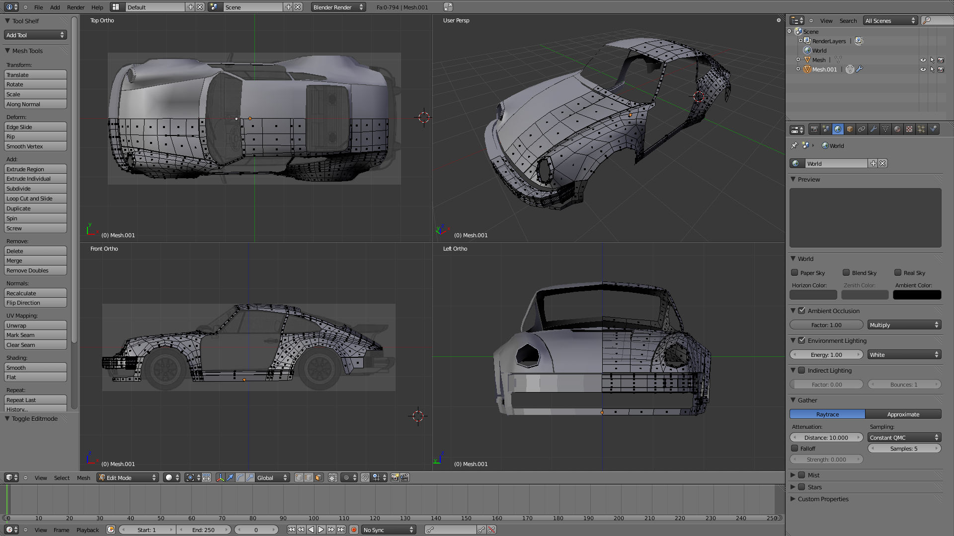 Buenas buenas después de mucho tiempo de no subir nada en el foro, debido a mis estudios y a unos trabajos varios, he decidido lanzarme al Blender de lleno, lo probé a lo largo de este mes que pasó y la verdad me encantó su interfaz (2.5 a2) y me pareció que la flexibilidad en cuanto a modelado en grandiosa así que, no siendo más doy paso a mi primer proyecto personal un porsce 911 turbo ahí les van una capturas.