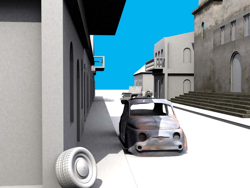 A parte también modelaría un poco de destrucción en edificios y quizás algún crater en la carretera de alguna explosión y sobre todo escombros por el suelo y quizás sacos tanto creando trincheras como en ventanas ya que en guerra eran muy usados para evitar los ataques aéreos. Un saludo.
