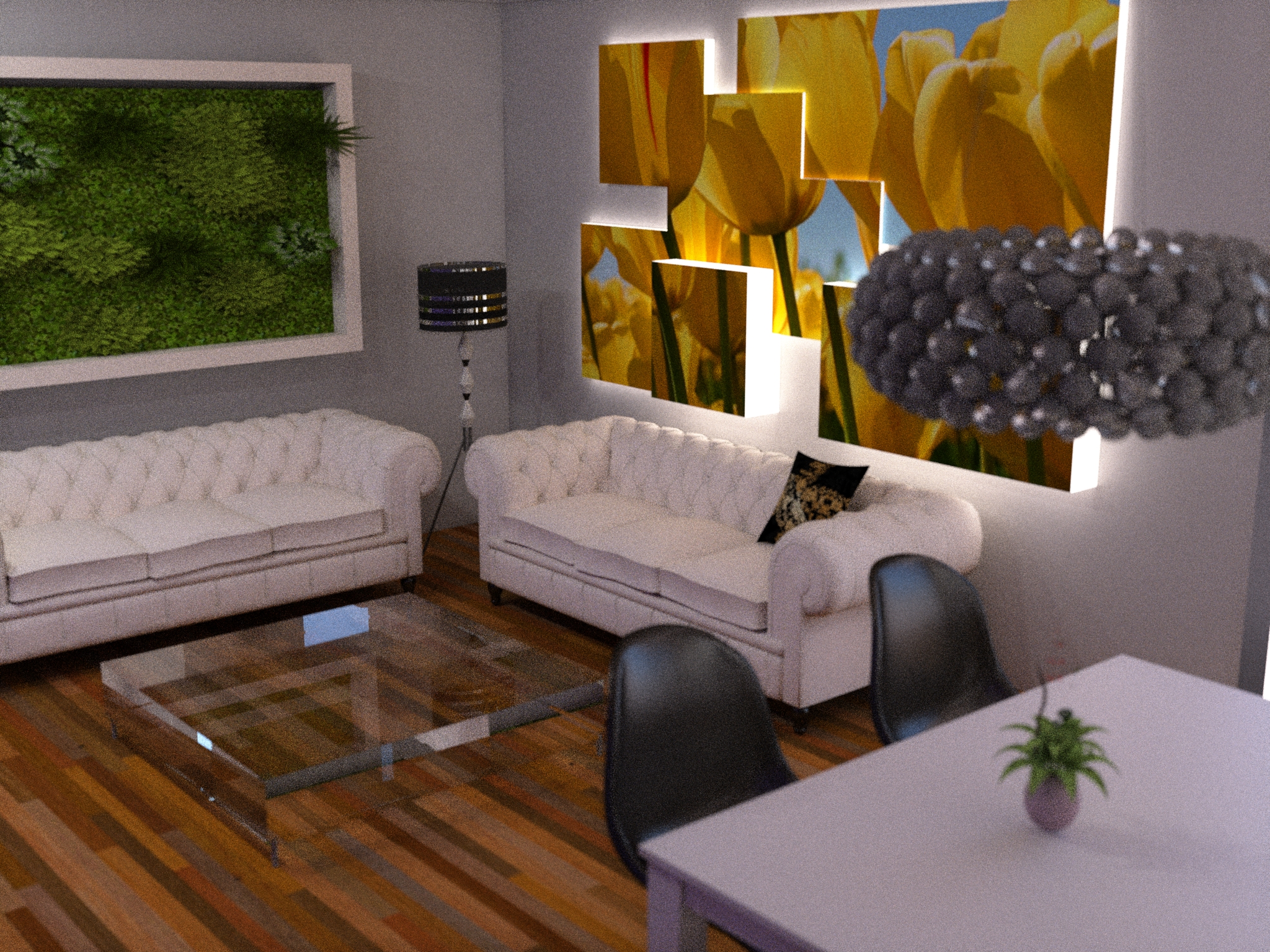 Como vas? Mira la escena a mi parecer es muy pobre aparte que tiene muchas deficiencias de iluminación, la verdad no he manejado SketchUp, tampoco me atrevo a cuestionarlo, pero si te aconsejaría que manejes Vray o mejores la técnica con este, hay muchas fallas, perdona que sea tan crudo, pero no deberías entregar un interior así, las texturas muy malas y ese concepto de vegetación en el cuadro no creo que esté bien, las luces no están dando buena iluminación, sobre todo la de la lámpara, el cuadro que has puesto atrás es muy grande, todo esto hace que una escena sea más realista, date cuenta en los detalles, otro error que veo es la cámara, la posición de la cámara, busca siempre un punto de fuga o si la vas a poner de frente que haya objetos a los cuales les puedas aplicar profundidad de campo, que no parezca que has puesto todo ahí como para la fotografía, bueno sigue adelante hay muchas noches por delante para trasnochar y aprender.