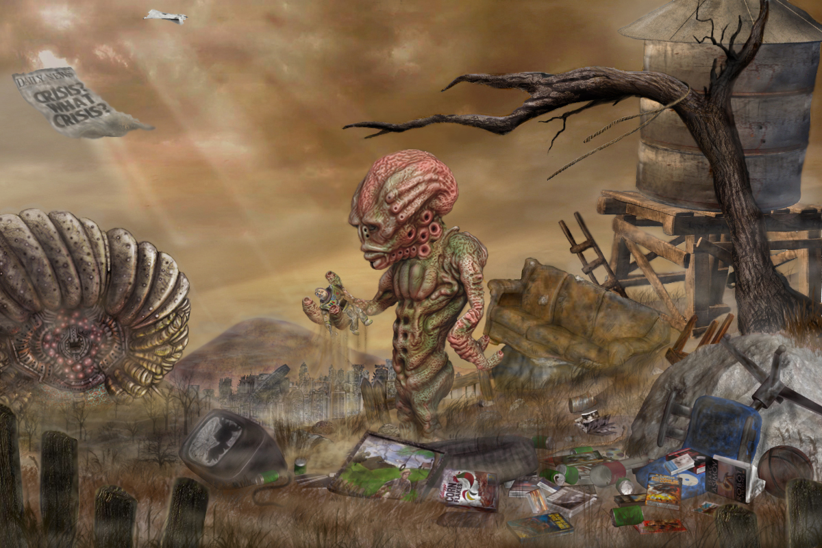 Uno de los alienígenas contemplaba el desolado paisaje, abandonado y destrozado, al igual que la raza humana contempló el abandono del progreso. Coge un muñeco de entre los escombros: un astronauta. Se sorprende ya que es la primera vez que ve una forma cercana ala humana y se apena por conocer la desaparición de estos del planeta. Pulsa uno de los botones del muñeco sin querer y suena: buzzlightyear al rescate. Hasta el infinito y más, allá.. La humanidad no fue más, allá, nego el progreso, la evolución, el corregir los errores que cometieron, prevenir el mal futuro que vendría y simplemente desaparecieron. El marciano no entendería nada de aquel ruido que emitió el juguete, pero en aquel momento no era un sonido lo que le haría entender lo que sucedía.