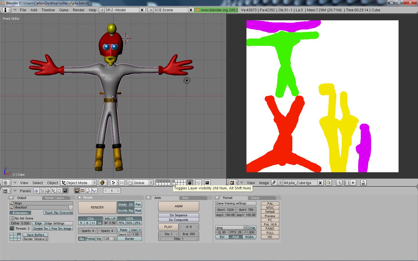 Y activamos el botón Texface del material para que nuestro personaje quede envuelto en la textura que cargamos.
