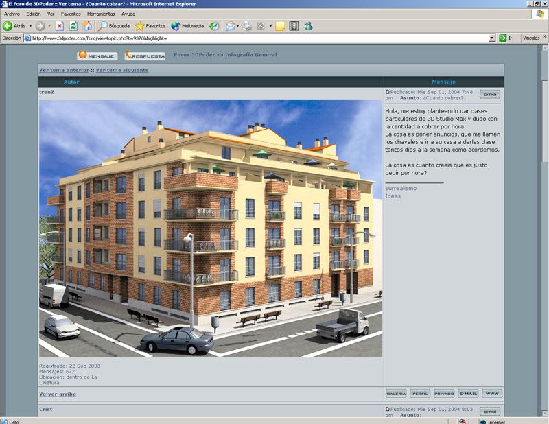 Hablando de avatares (qué bien me ha sentado la potada): Trenz, no sé que demonios has hecho, pero de avatar tuyo me sale una estupenda edificación tamaño 800 por 600 que fastidia todos los hilos donde escribes o se me ha rayado el navegador, vamos.