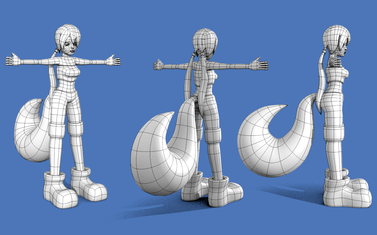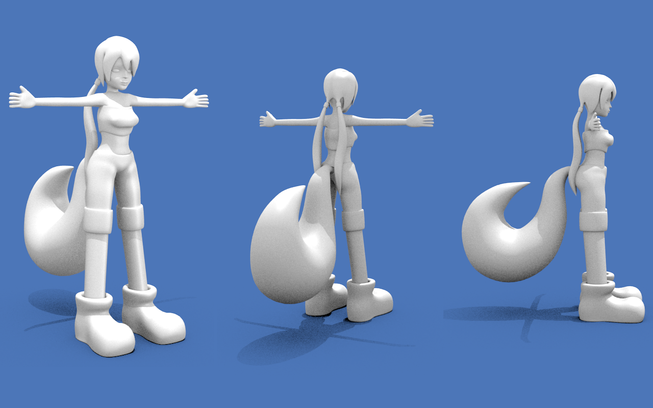 Buenas de nuevo. Gracias por los consejos, he arreglado algo las proporciones (excepto el brazo que no sé porque, me gusta así.) y le he dado forma a las piernas, también me hecho un par de tutoriales de rigging y, he aquí el primer resultado, obviamente la postura es solo una prueba y hay que corregir muchas cosas, pero para ser el primer intento, estoy contento.