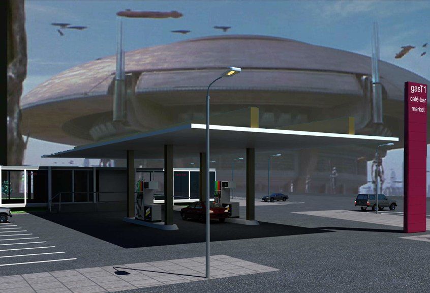 Bueno, como veis es una gasolinera modelada e iluminada en 3dsmax y Vray. Creo que quedaría mejor llenando todo ese vacío azul que queda a la derecha, pero no sé cómo ni con que y además no tengo mucho tiempo.