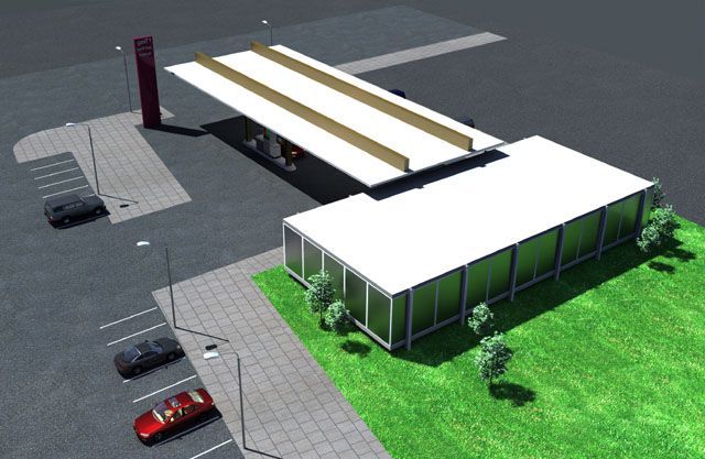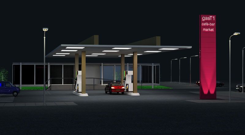 Marypeich, ponle luces al techo de la gasolinera, quedará bastante mejor, si es de día apaga la luz de la farola y si es de noche pues déjala, creo que para la intención que pretendes y como presentación realmente quedarían muy bien dos renders uno de día y otro de noche y así resaltaría bien la gasolinera.