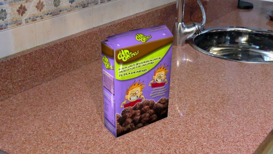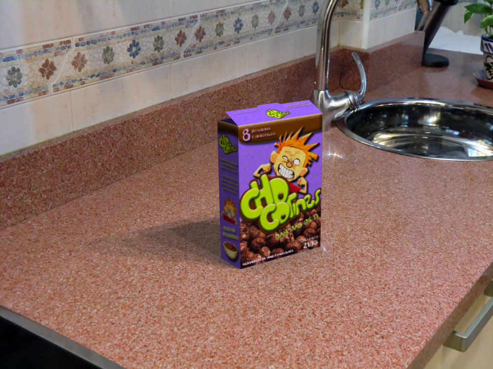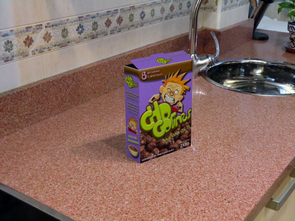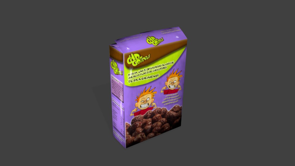 Te ha quedado muy bien la caja de cereales, licanluis, aunque la caja parece que lleva una copa de más. Abajo en la imagen se ve un brillo, ¿has probado a quitarle el especular al plano?