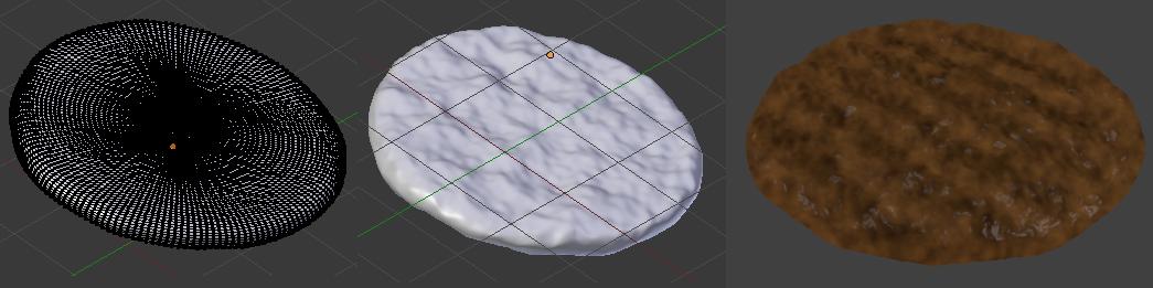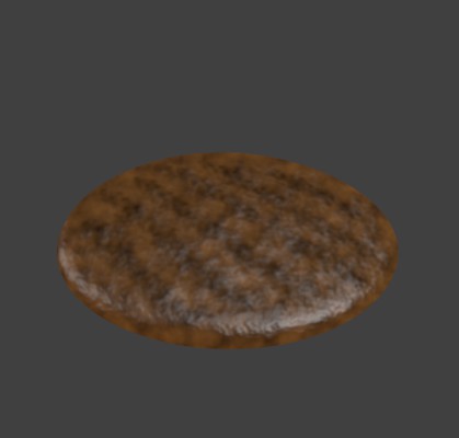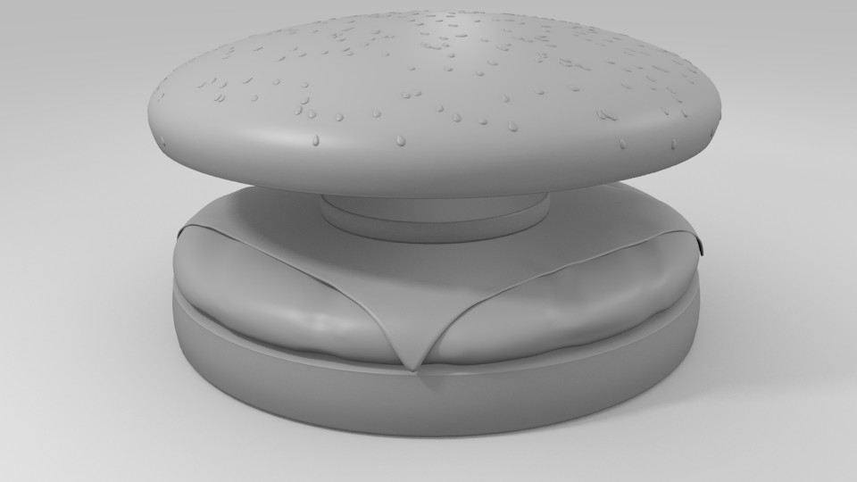 Lo del pelo y quizás un escupitajo si le he caído mal al camarero de momento lo dejo en paso. Bueno, ahí va otro intento. He subdividido más la hamburguesa y he estado enredando con el Sculpt, pero como no conseguí nada medio decente al final la rugosidad se la he dado con el modificador displace.