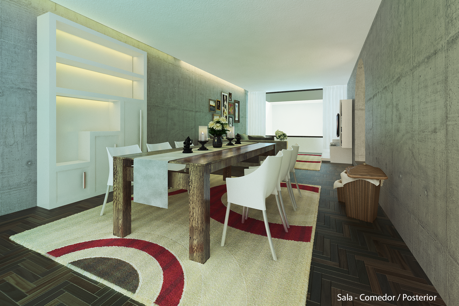 De la decoración cada uno es un mundo y solo dejo ver mi opinión, que no es lo importante en tu render, pero no me gusta nada en absoluto, no sé, la mezcla de hormigón visto, maderas, alfombras y acabados ibicencos, no me sale la suma, pero repito, es mi punto de vista, que no me mate el arquitecto.