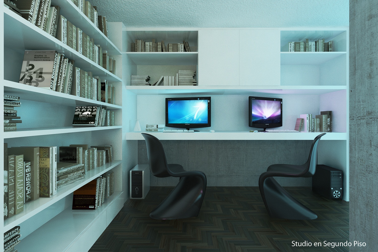 En la vista del salón televisión, hecho en falta luces de techo, no sé cómo va solucionada esa zona. Otro tema, te lo digo por consejo ergonómico, las sillas de la zona de estudio, ocio, vamos los ordenadores, es un suicidio pasarse un rato largo sentado al PC en esa silla (las he probado y no valen para ese uso), sin duda es más cómodo una silla de ruedas con respaldo ajustable, etc.